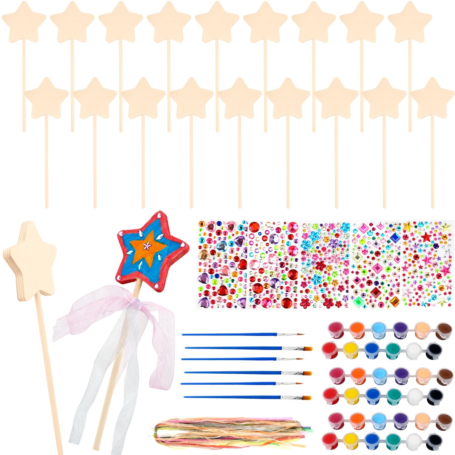 - 【Package Contents】: You will get 20 children DIY 3D wooden star wands, 5 gemstone stickers, 5 styles of stickers, namely heart-shaped gypsophila, plum blossom gypsophila, five-pointed star gypsophila, round gypsophila, and square gypsophila, 1 of each style. You will also get 20 mixed color ribbons, 6 acrylic paint and 6 brushes, a total of 57. Sufficient quantity and beautiful styles can meet your needs of designing your favorite fairy wands in activities