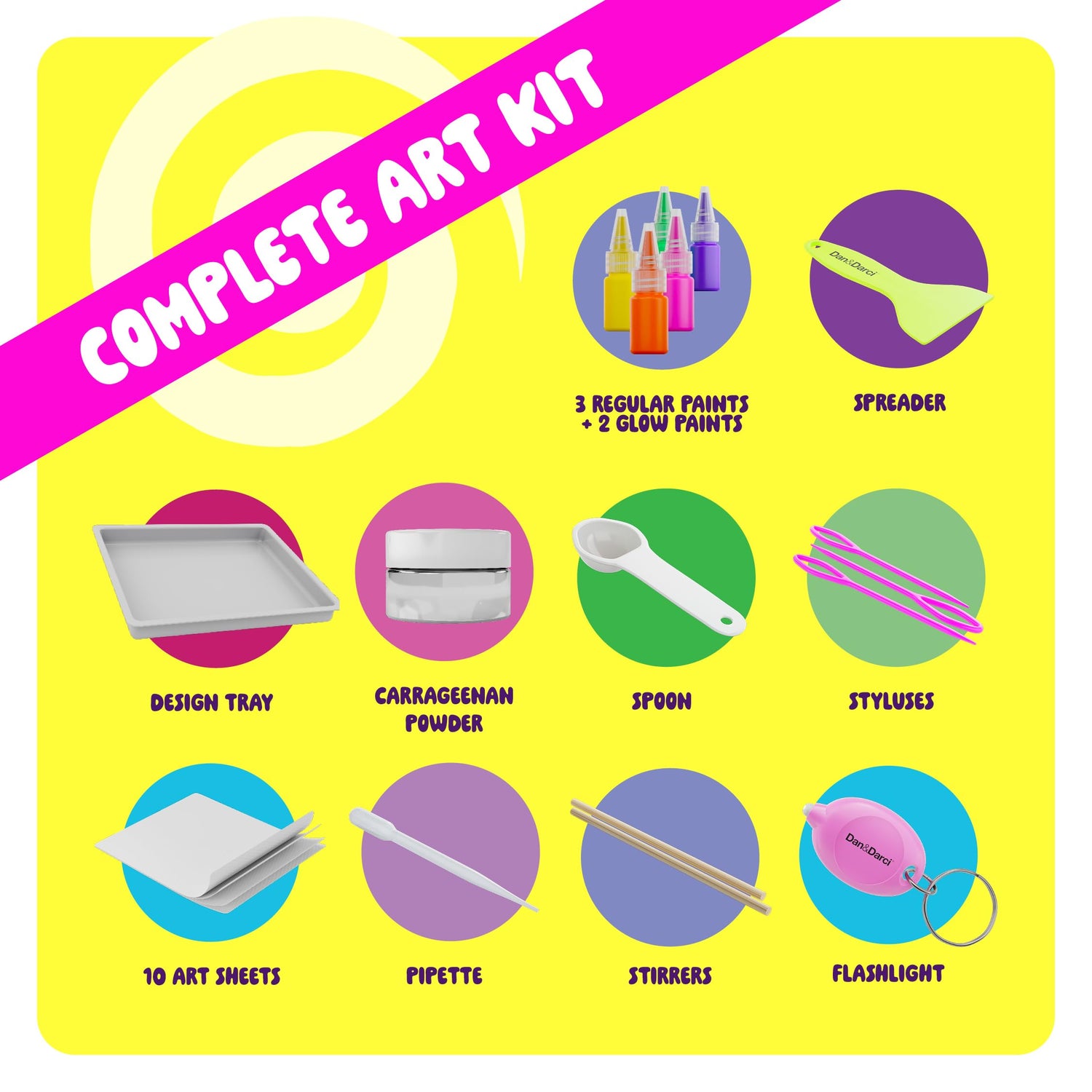 - COMPLETE ART KIT: Comes fully stocked with everything needed to start right away: art tray, 3 regular paints, 2 glow-in-the-dark paints, carrageenan powder, spreader, spoon, styluses, 10 art sheets, pipette, stirrers, and a flashlight to activate the glow effect.