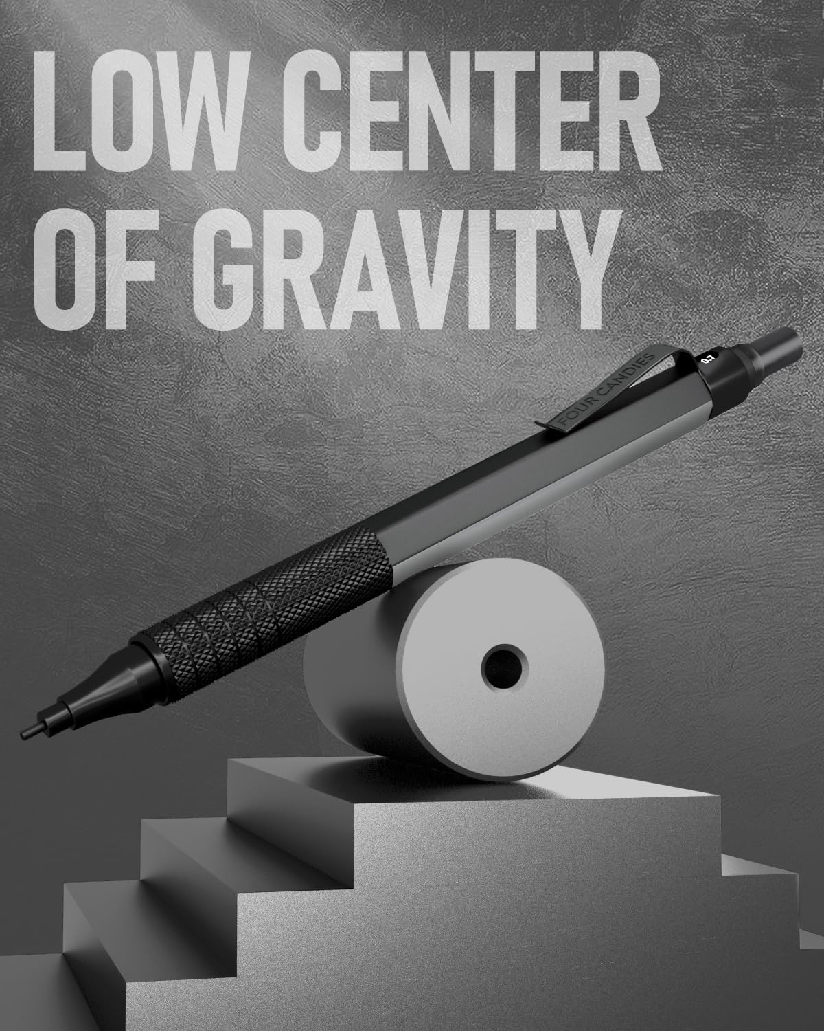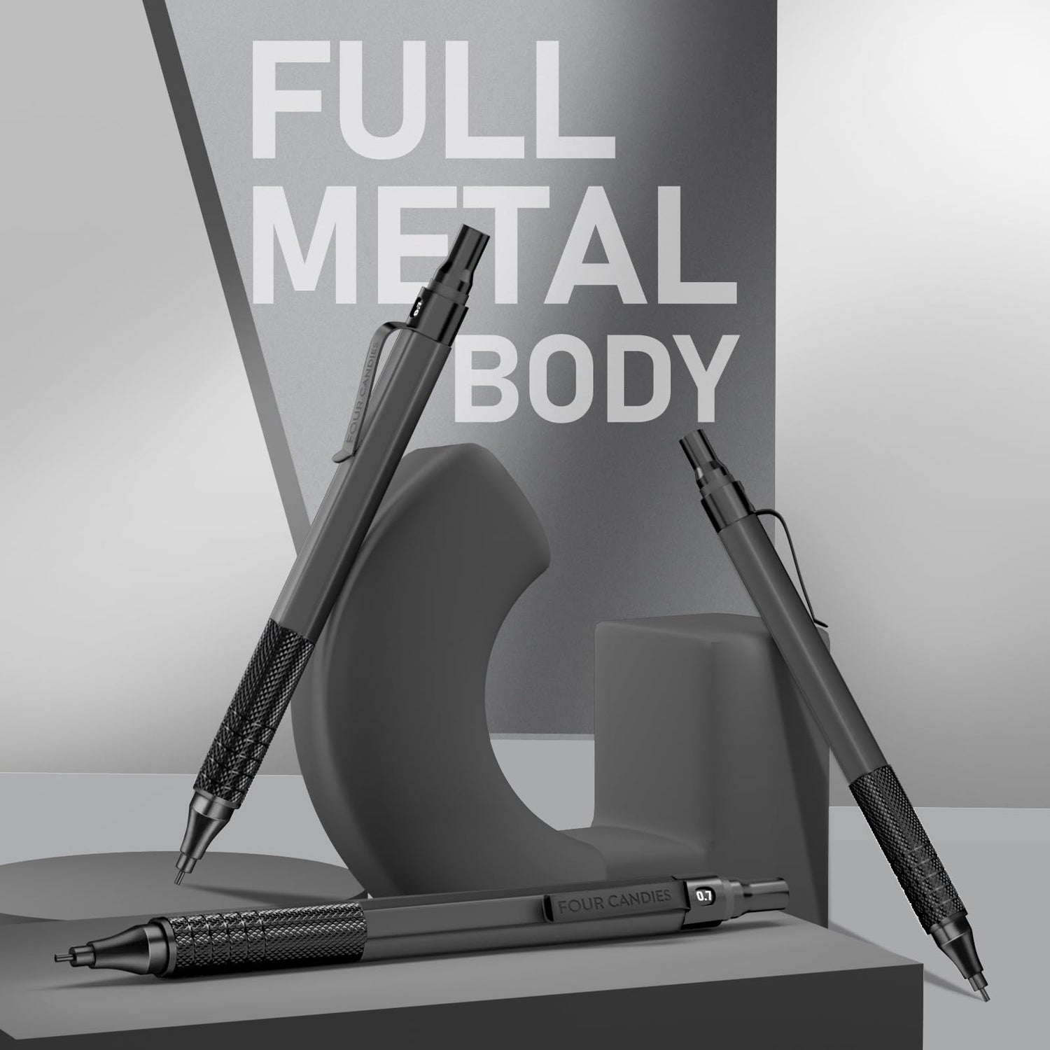 Four Candies Mechanical Graphite Pencil Set, 3pcs Black Metal Pencils with Anti-Skid Grip, Ideal for Artists, Professionals, Teachers and Students