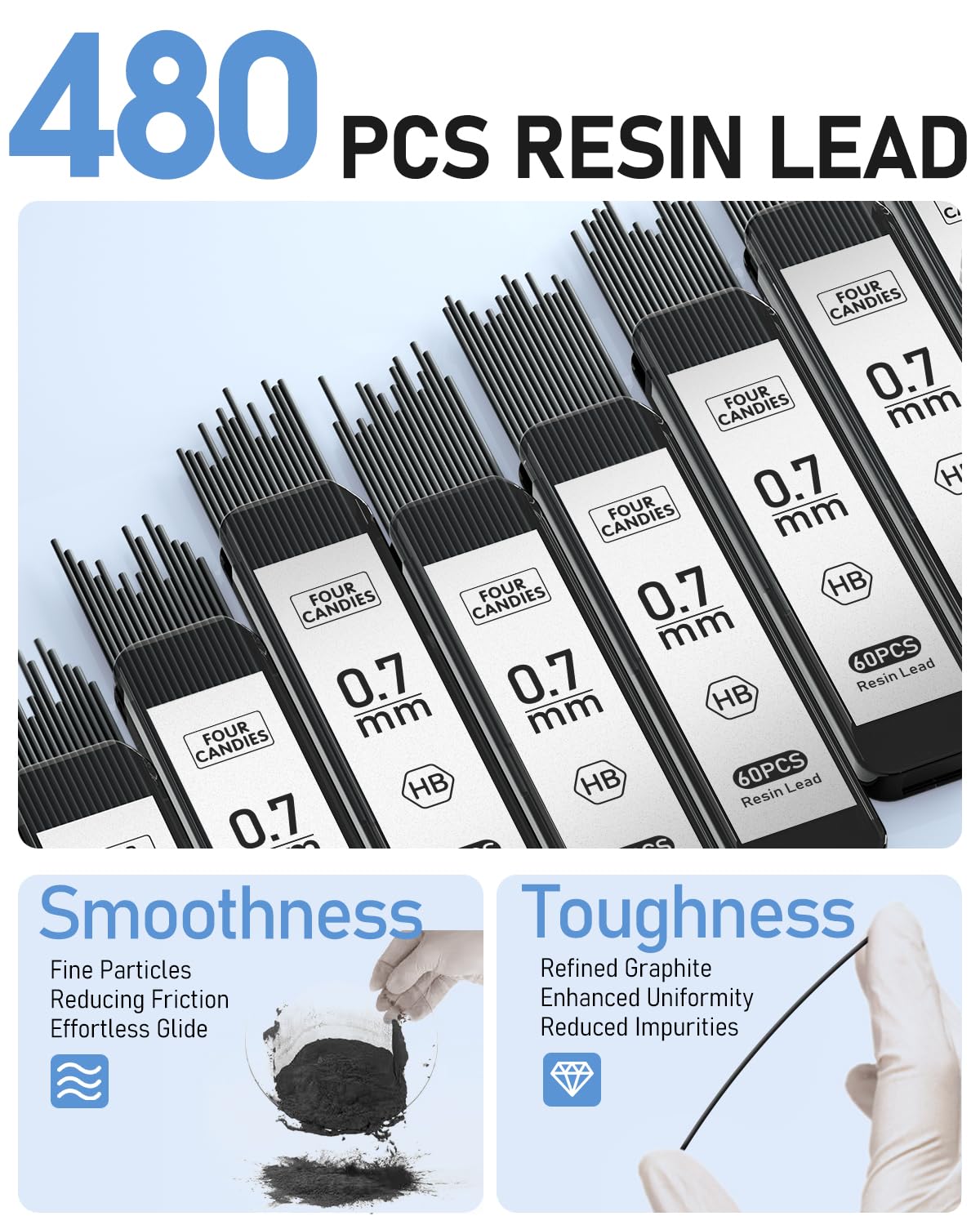- 480PCS Resin Lead: 8 tubes of 60pcs super capacity leads. A more durable resin lead which doesn’t require sharpening and is not easy to break at the tip or break in the shaft, provides ultra-smooth writing and clear dark lines.