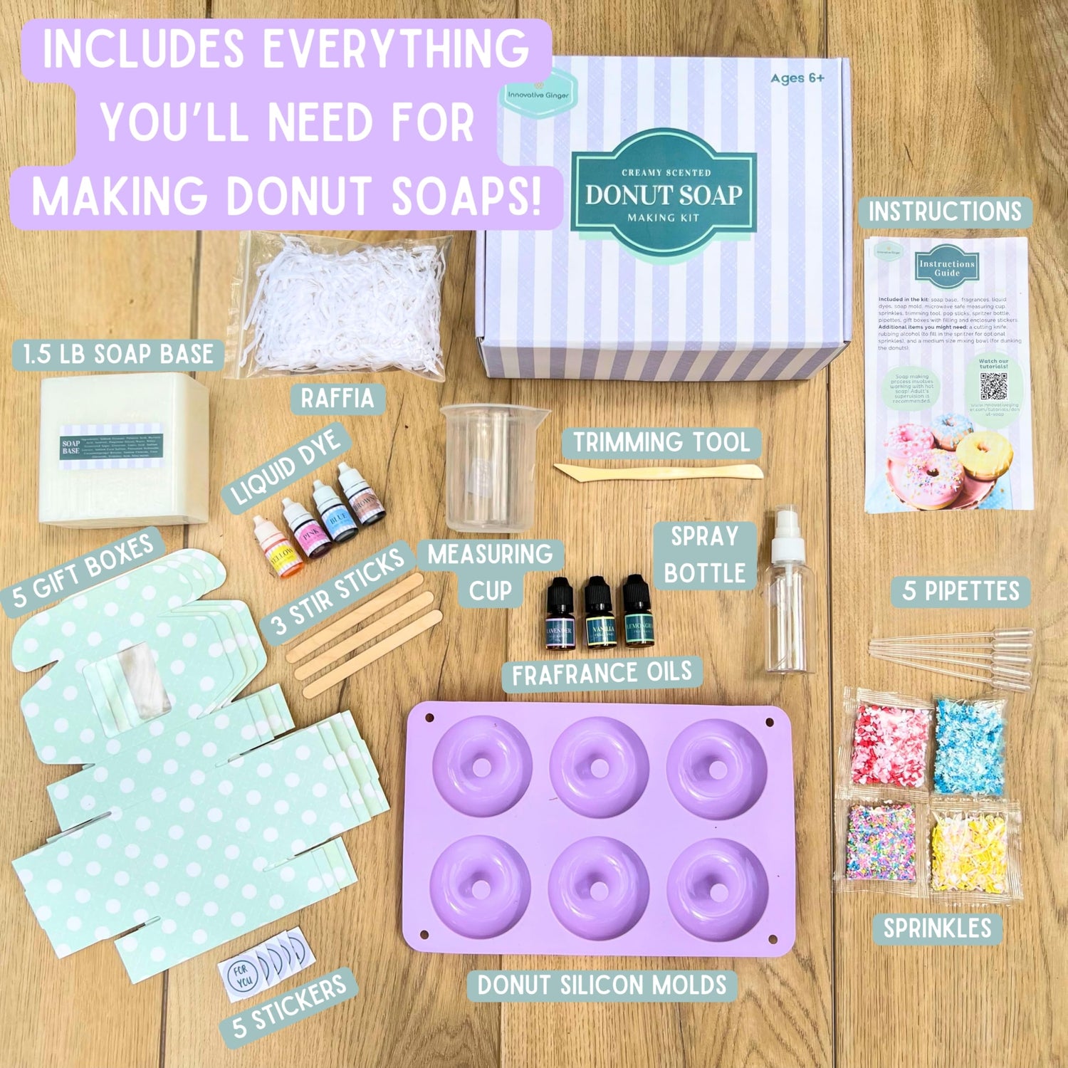 Innovative Ginger DIY Donut Soap Making Craft Kit for Kids, Teens, and Adults - Fun, Easy, Creative - Large Soap Donuts - Perfect Birthday & Holiday Gift - Unique, Mess-Free, All-in-One Kit (Donut)