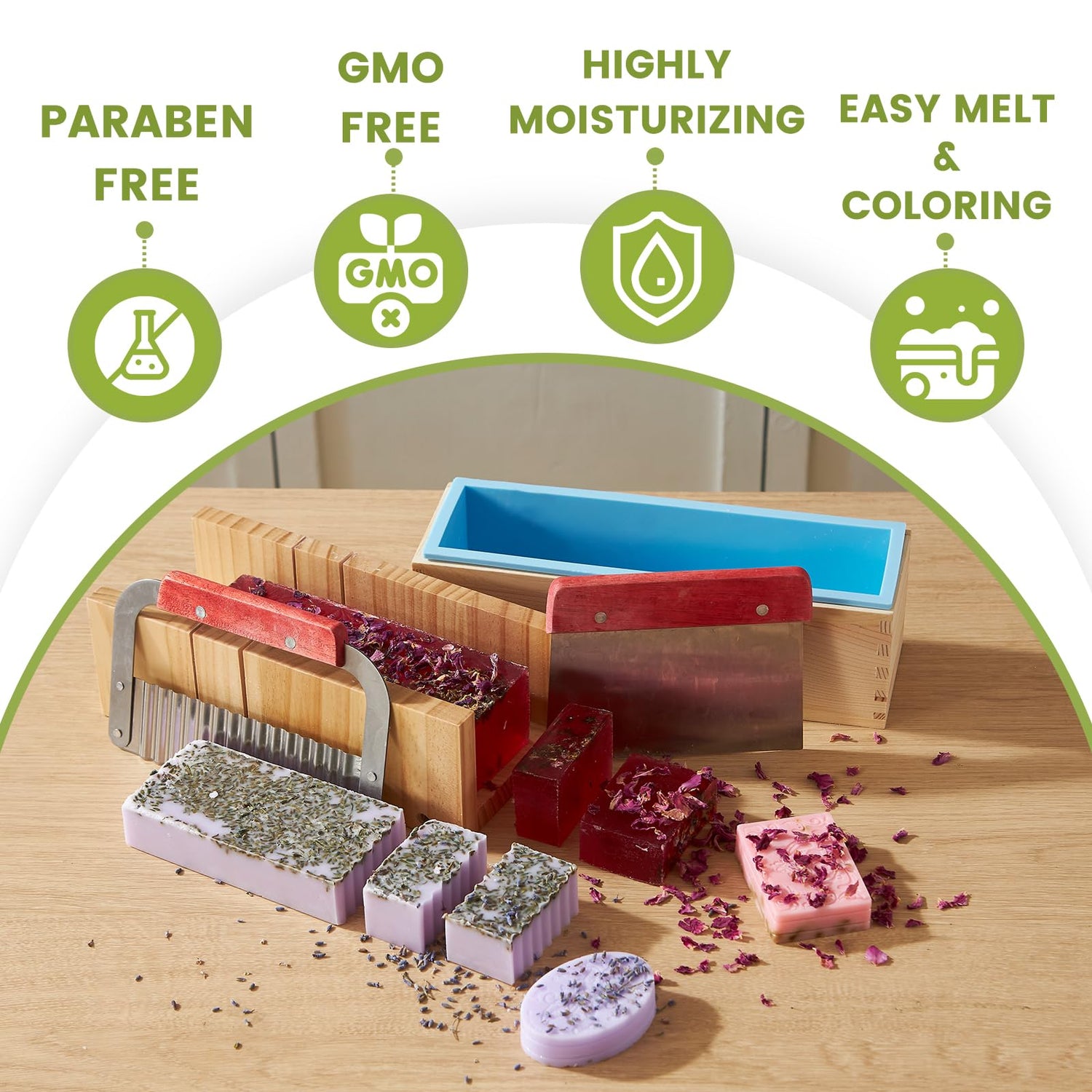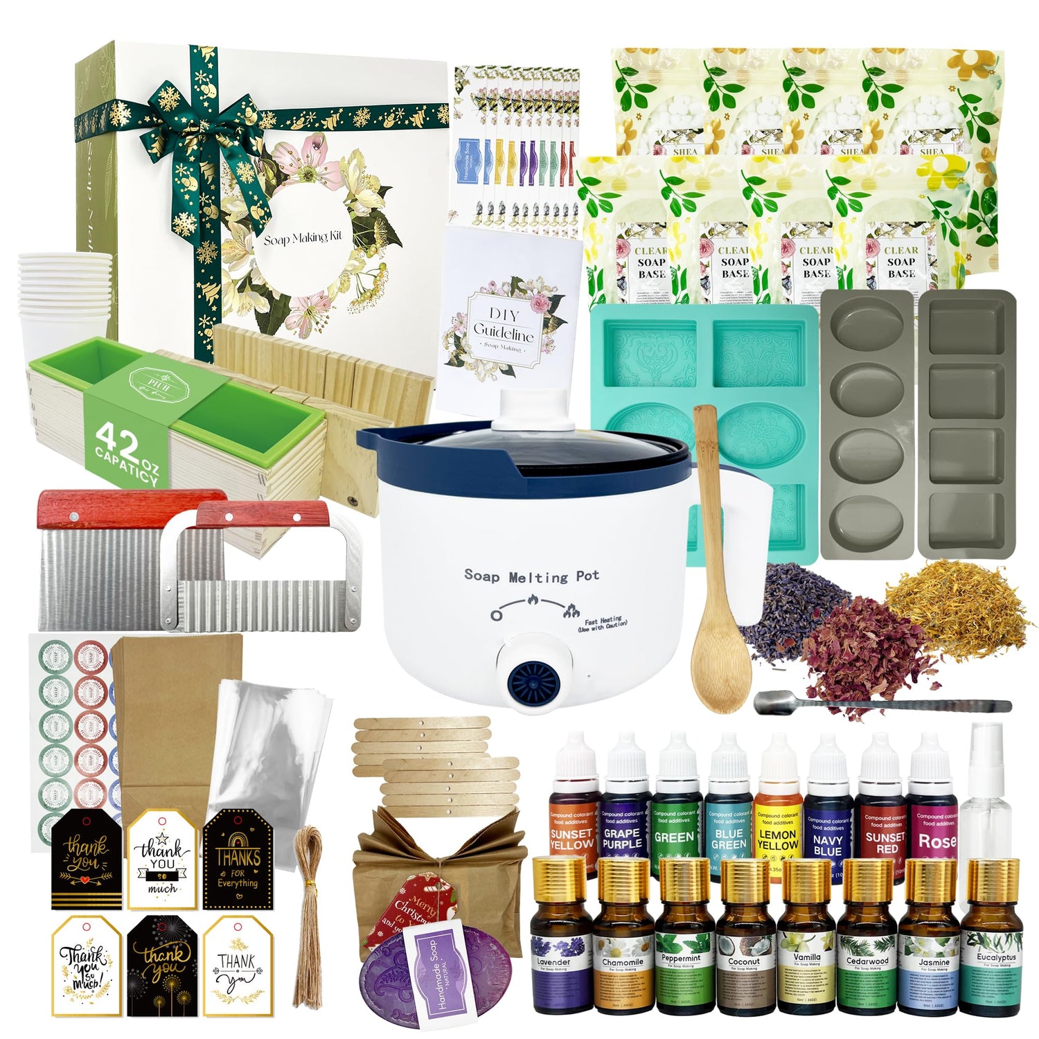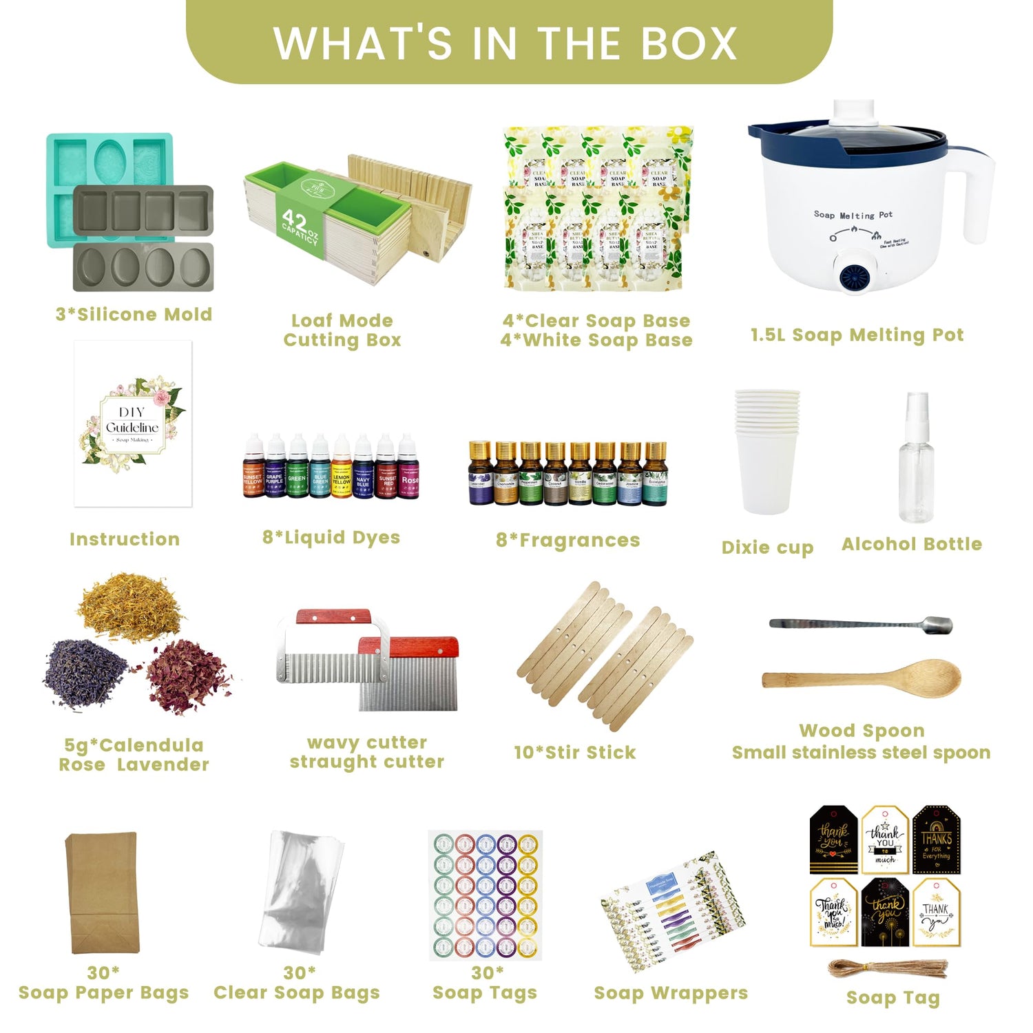 - What Will You Get: The soap making kit includes: electric soap melting machine x 1, wodden spoon & steel spoon x each 1, 250g shea butter soap base x 4, 250g glycerin soap base x 4, liquid dyes x 8, essential oils x 8, silicone mold x 2, loaf mold x1, cutting box x1, clear soap bag x 30, paper soap bag x 20, soap wrappers x 10, wavy & straight cutter x1, stir stick x 5, alcohol bottle x1, disposable cup x 10, soap sticker x 30. All you need to make soap are included