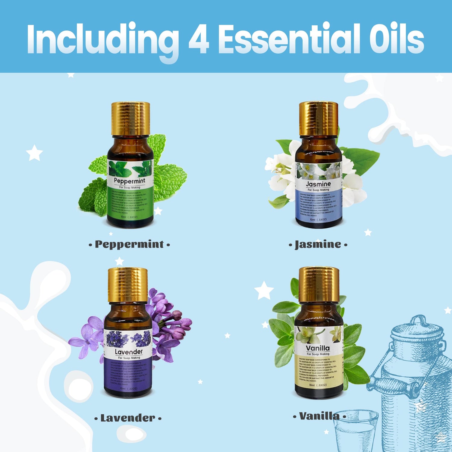 • What Will You Get: The soap making kit includes: electric soap melting machine x 1, wodden spoon & steel spoon x each 1,250g goat milk soap base x 5, dyes x 4, essential oils x 4, silicone mold x 4, loaf mold x1, cutting box x1, clear soap bag x 30, soap wrappers x 10, wavy & straught cutter x1, stir stick x 10, alcohol bottle x1, disposable cup x 10, soap sticker x 30.All you need to make soap are included