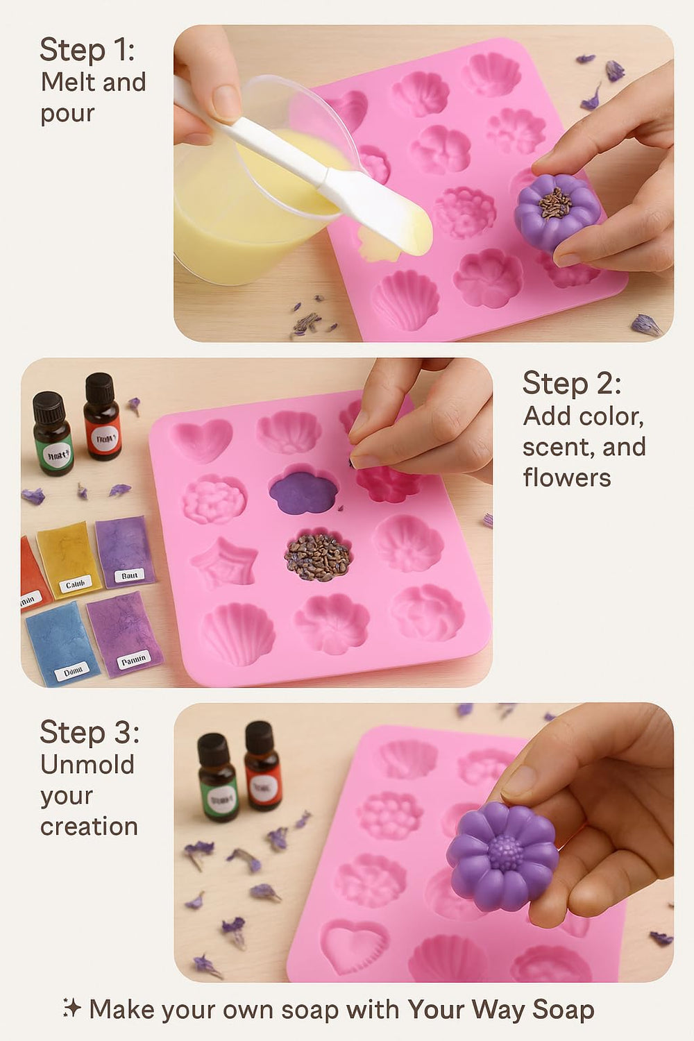 - 🎨 Create, have fun, and relax: Combine vibrant colors, natural scents, soft textures, and floral decorations to design unique soaps in your own style. It’s as easy as melting, mixing, and pouring. And the best part: you’ll enjoy every step of the process.