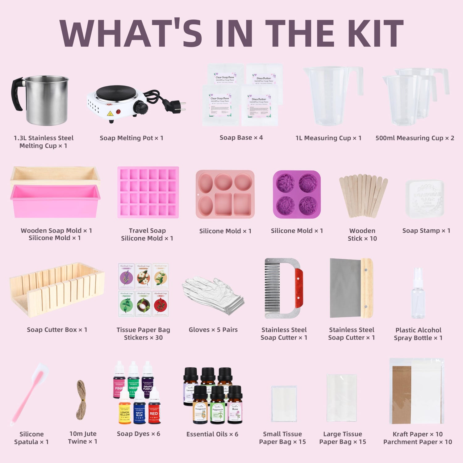 - Complete Soap Making Kit for Beginners: Includes 4 lbs melt and pour soap base, 1 soap melting pot, silicone soap molds, spray bottle, 6 essential oils, 6 dye liquids, packaging bags, stickers, wrapping papers, cotton twine, gloves, stirring sticks, soap cutter tools, and an exclusive soap stamp. Clear instructions included—perfect for adults and beginners.