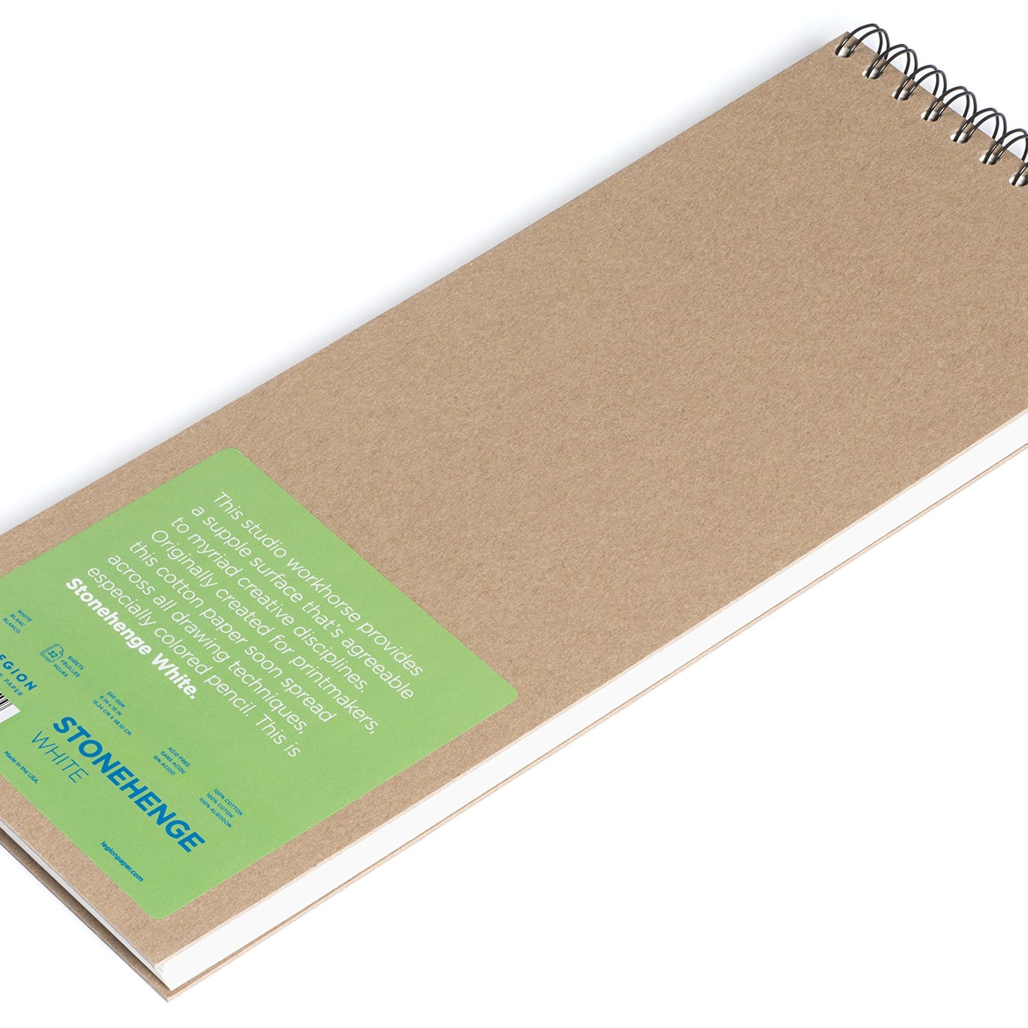 Details: This 6 by 15 inch spiral bound journal includes 32 sheets of acid-free and pH neutral 100 percent cotton Stonehenge paper in white. Each journal features a rigid unfinished cover that can be left plain or personalized. The double spiral binding allows both covers to fold back and the paper to lie perfectly flat. The versatile 90 pound heavyweight paper can be used with various art applications including pencil, pastel, paint, ink, screenprinting, etching and more. Stonehenge is a high quality, archival paper that is cost efficient. Made in the USA.