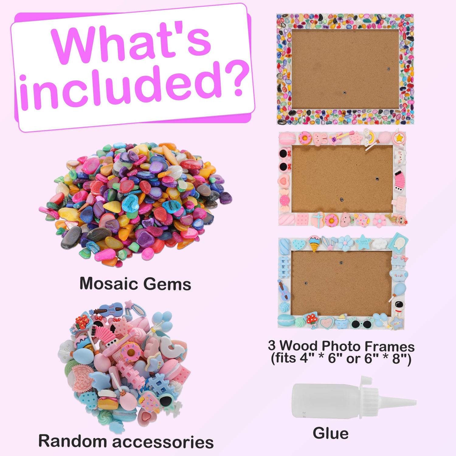 - ❤️【Unleash Creativity with Mosaic Art】 This kit comes with everything needed to create three stunning mosaic picture frames. It provides budding artists with the tools and guidance to craft their own unique masterpieces. The mosaic design allows for endless creativity, as kids can mix and match tiles to create patterns, pictures.