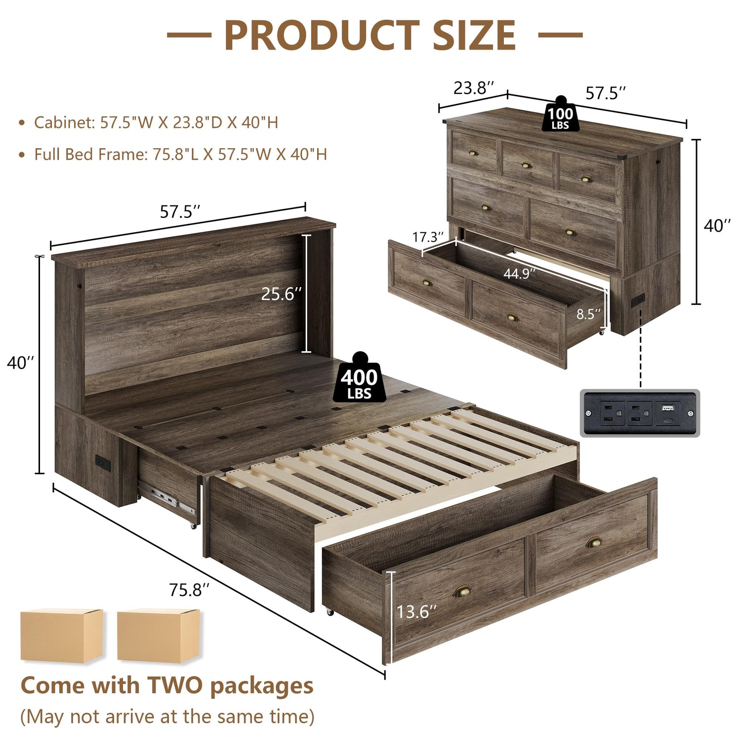 AMERLIFE Full Size Murphy Bed, Farmhouse Wooden Cabinet with Charging Station and Storage Drawer for Bedroom/Office/Guest Room, Grey Oak