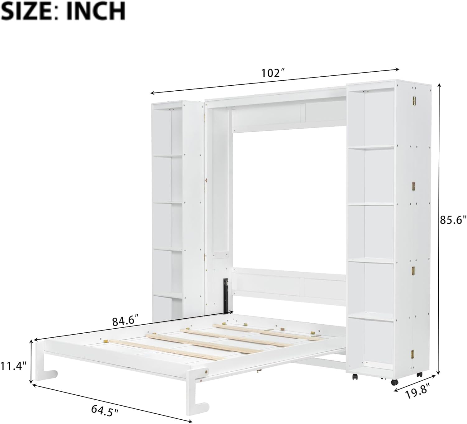 Foldable Queen Murphy Bed Cabinet with Storage Bookshelf Bookcase, Wood Hidden White Murphy Wall Bed with Storage Shelves for Adults