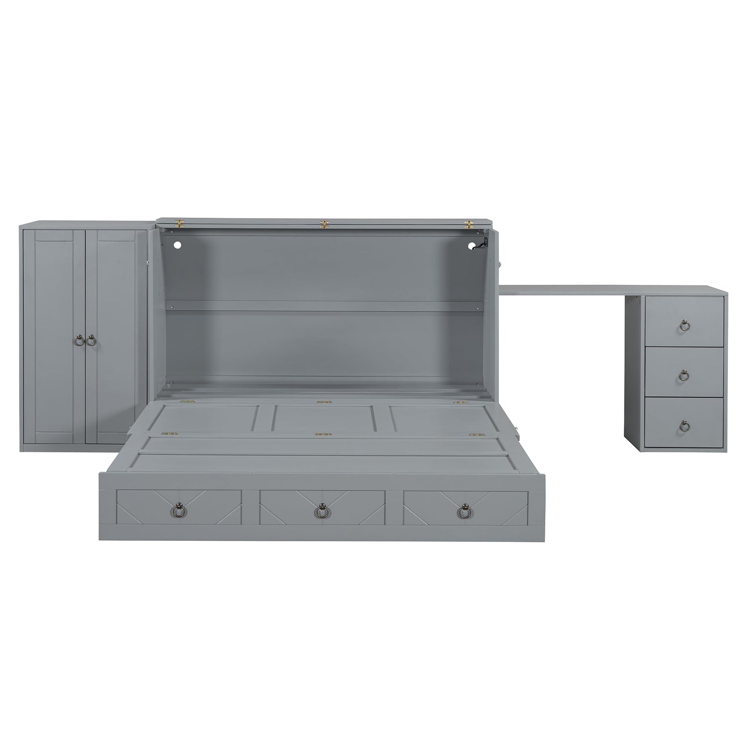 Harper & Bright Designs Queen Size Murphy Bed with Desk, Wooden Queen Murphy Bed with USB Port, Large Drawer and Wardrobe, Gray