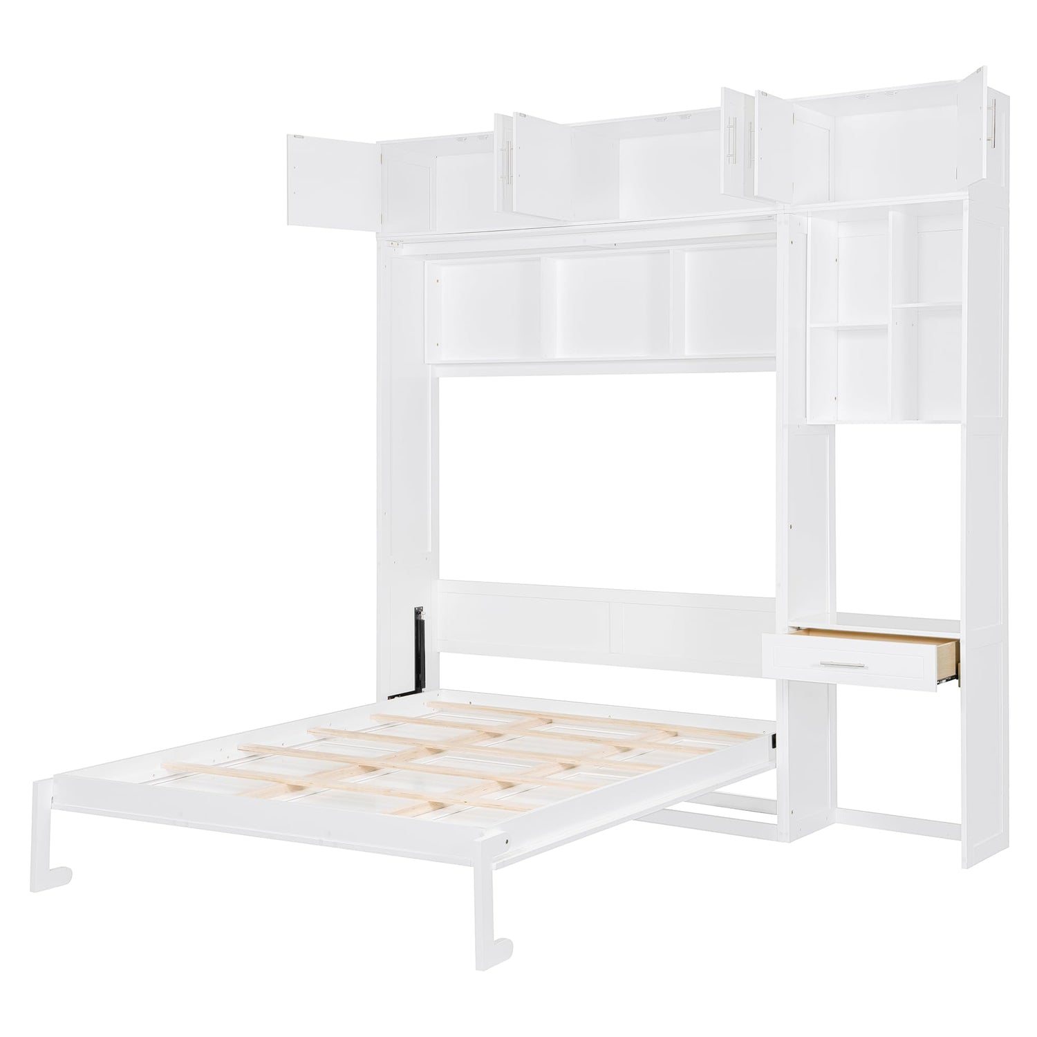 Harper & Bright Designs Queen Size Wall Murphy Bed with Desk, Wooden Queen Size Wall Bed with Storage Top Cabinet and Storage Shelves, White