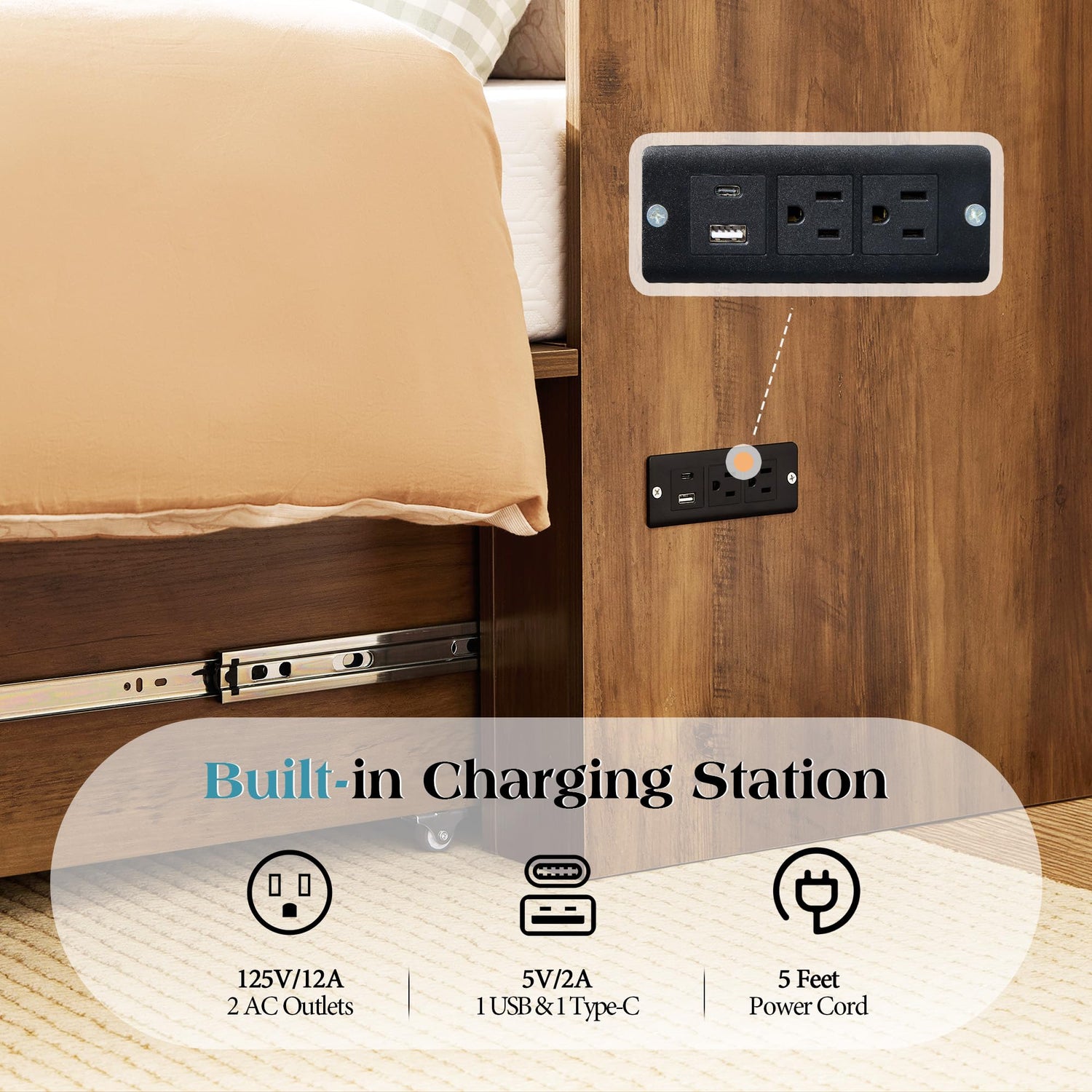 • 【Built-In Charging Hub】Features 2 AC outlets, 1 USB, and 1 Type-C port—charge your phone or laptop directly from bed without messy cords or adapters. Great for working, relaxing, or reading at night