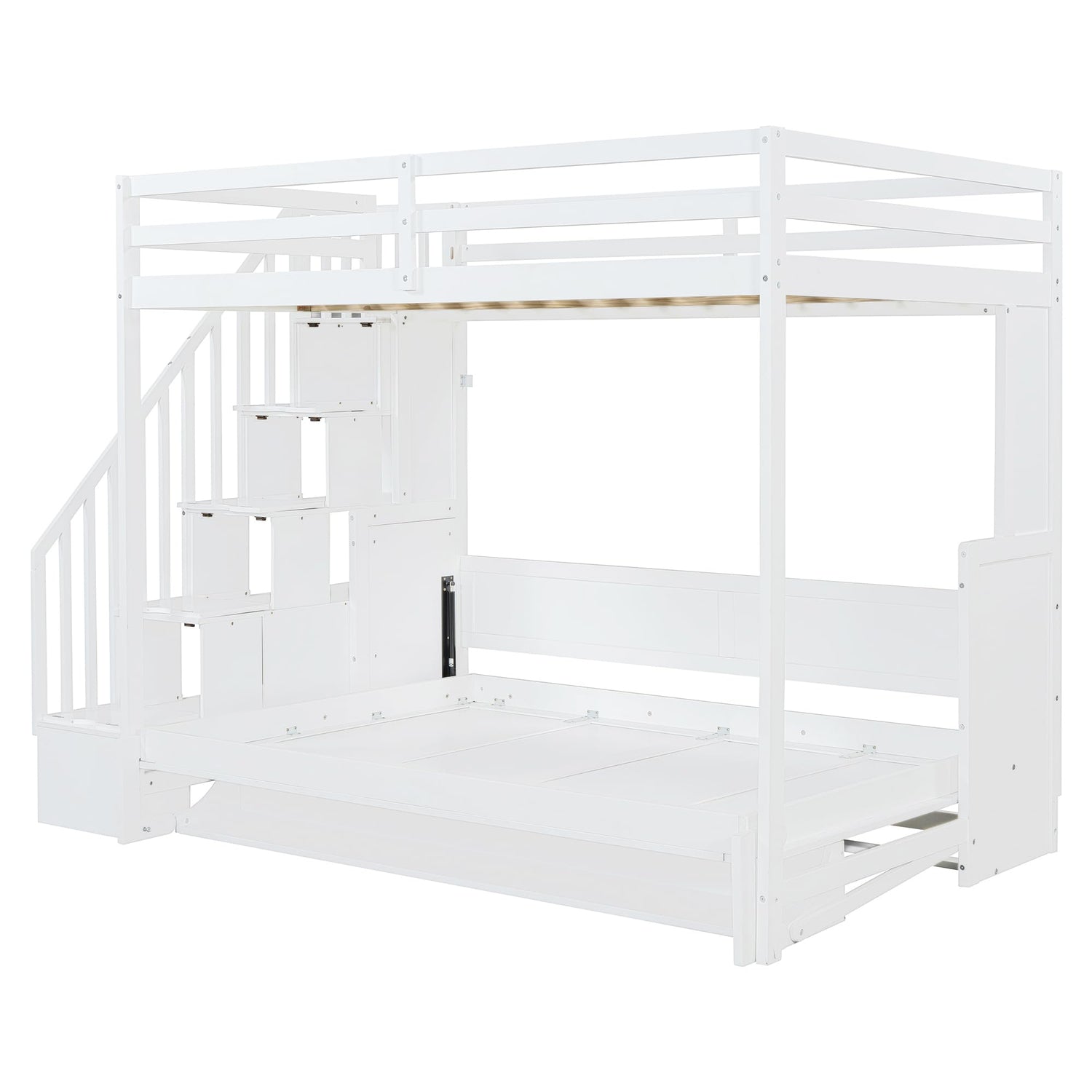 Merax Full Over Full Farmhouse Loft Bed with Murphy Cabinet Bed w/Hydraulic Lift, Solid Wood Wall Bunk Bed with Storage Staircase, Shleves & Desk/No Box Spring Needed/Easy Assemble/White