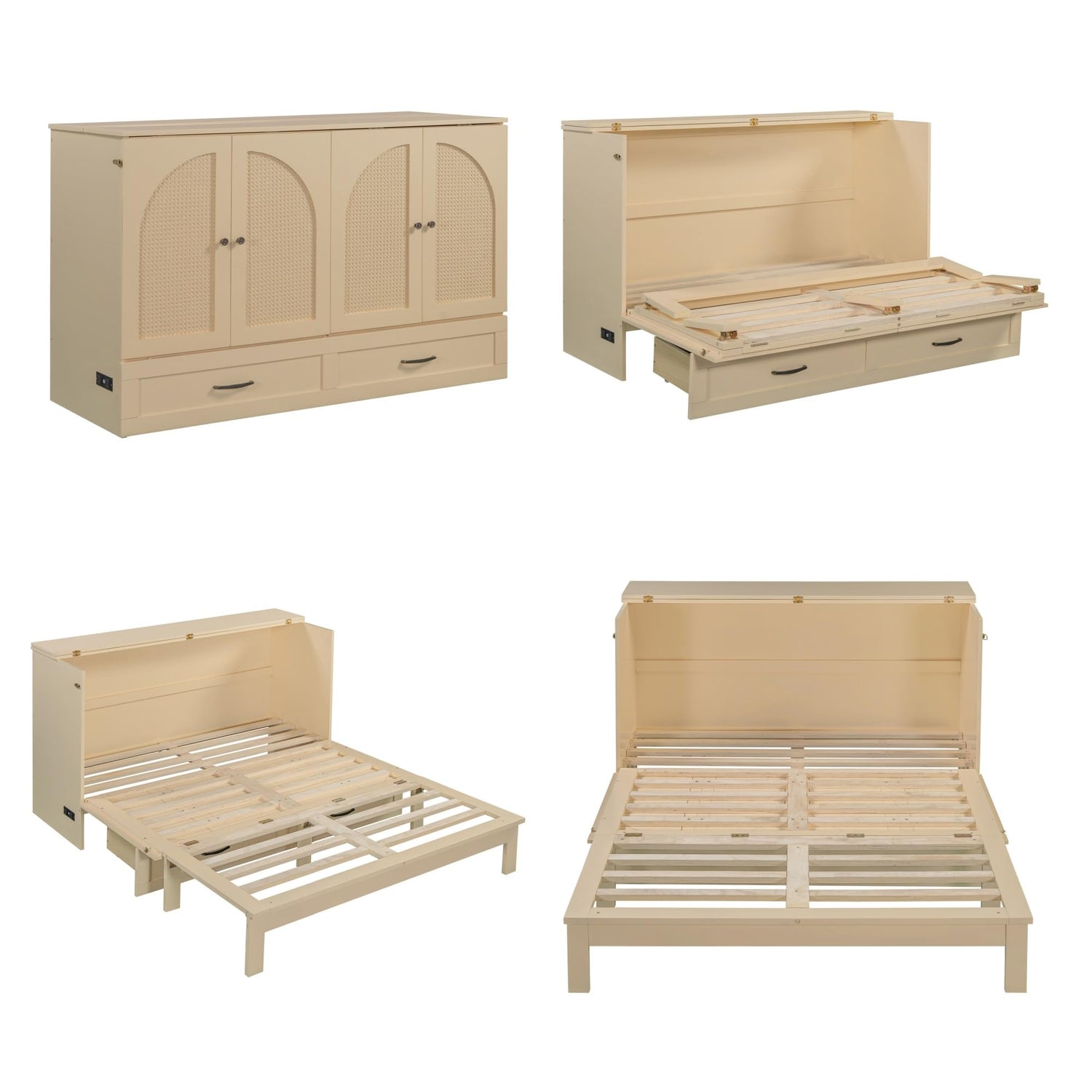 Merax Queen Size Murphy Bed Cabinet with Charging Station, Large Storage Drawer, Foldable Pull Out Murphy Chest Bed for Apartments, Bedrooms, Studio, No Spring Box Needed, Gold