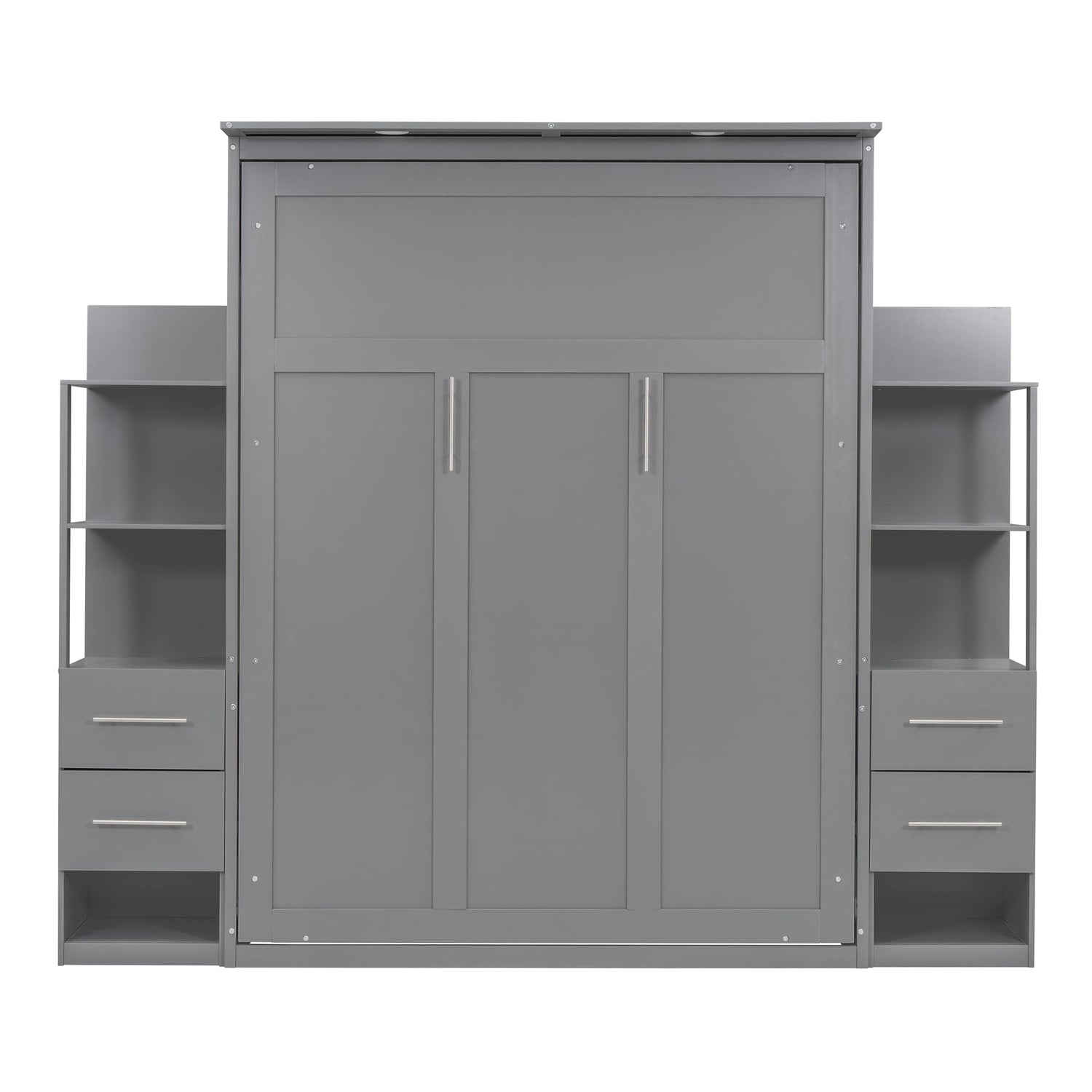 Merax Queen Size Murphy Bed, Wooden Queen Wall Bed with LED, Shelves and Drawers, for Small Room or Home Office, Gray