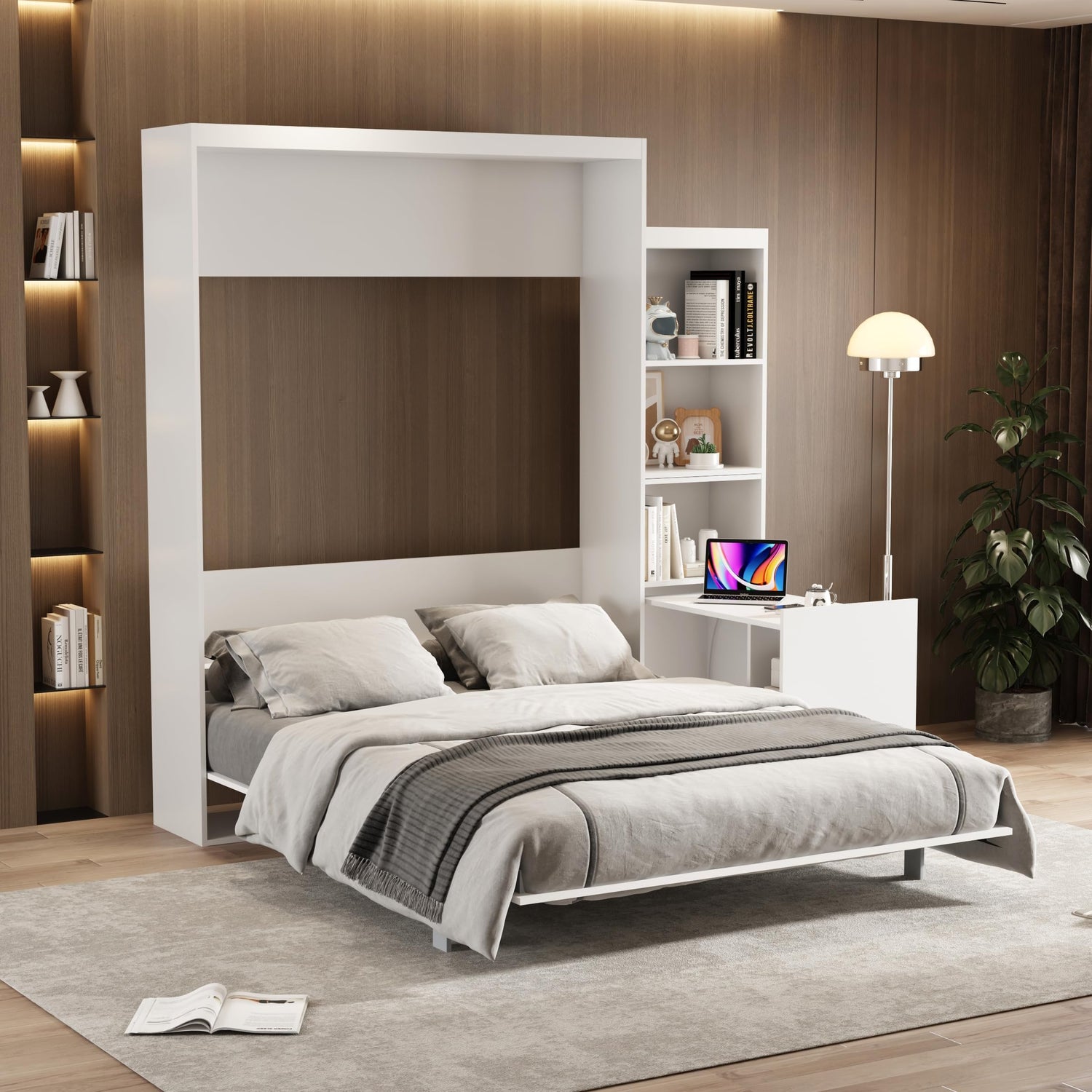 - 🌜With Fold-Out Desk & Storage Shelf: One side of the Murphy bed is equipped with a folding table and storage rack, which can display collectibles or artworks on the shelf. Pull out the folding table, a simple table that allows you to immerse yourself in work, study, or game.
