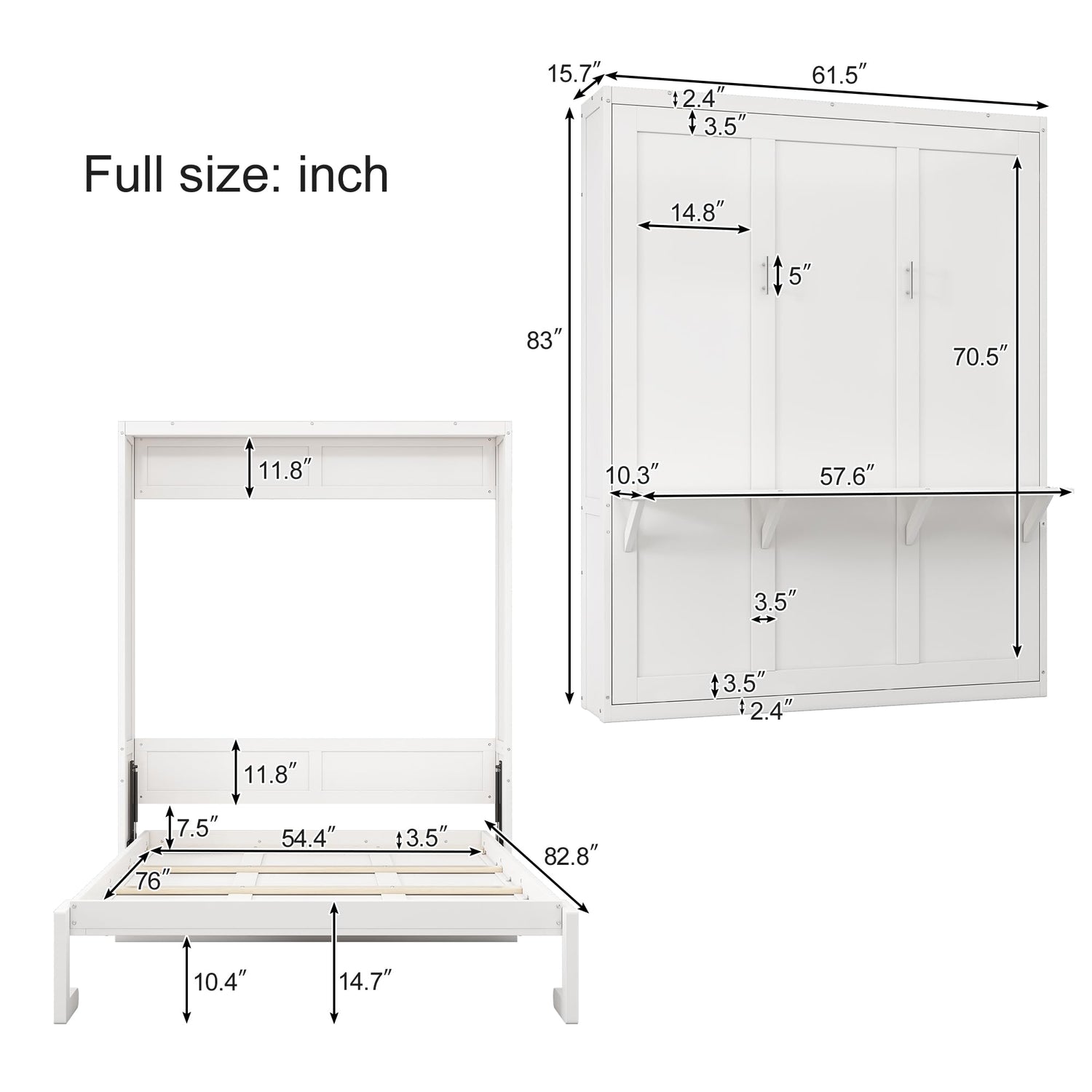SOFTSEA Murphy Bed with Desk Full Size, 61.5 inch Foldable Wall Bed for Guest Room Study Room Bedroom Apartment, Home Office Wood Murphy Cabinet Bed, White