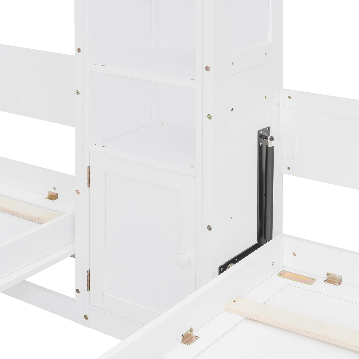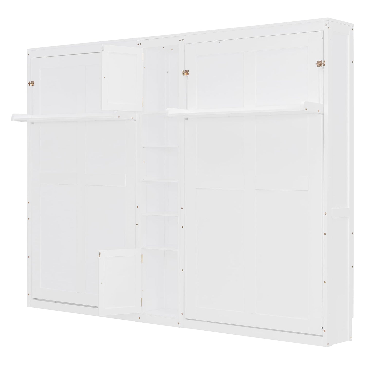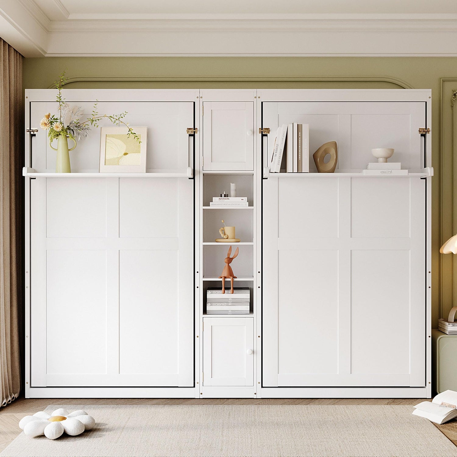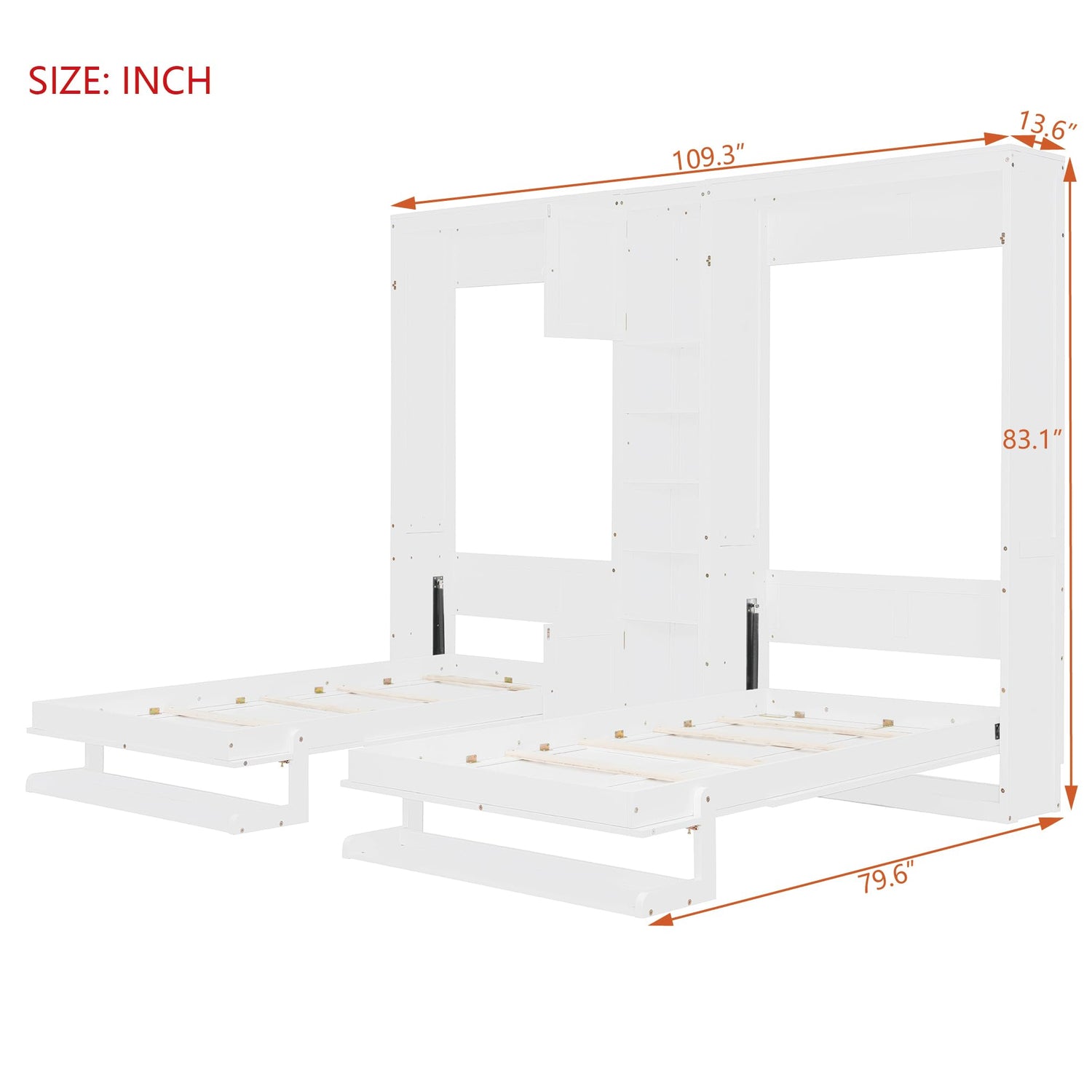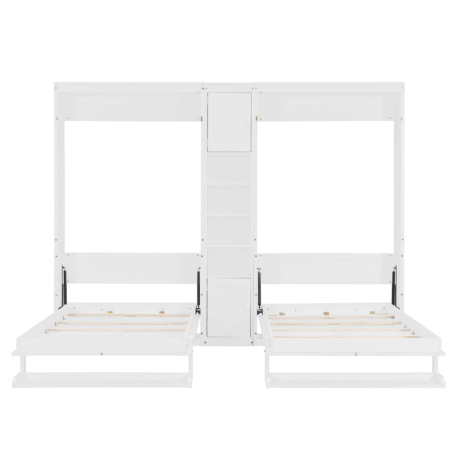 SOFTSEA Twin and Twin Size Dual Murphy Bed with Cabinets and Shelves, Hideaway Platform Bed Frame with 2 Cabinets, 2 in 1 Design, for Home Guest Room, White