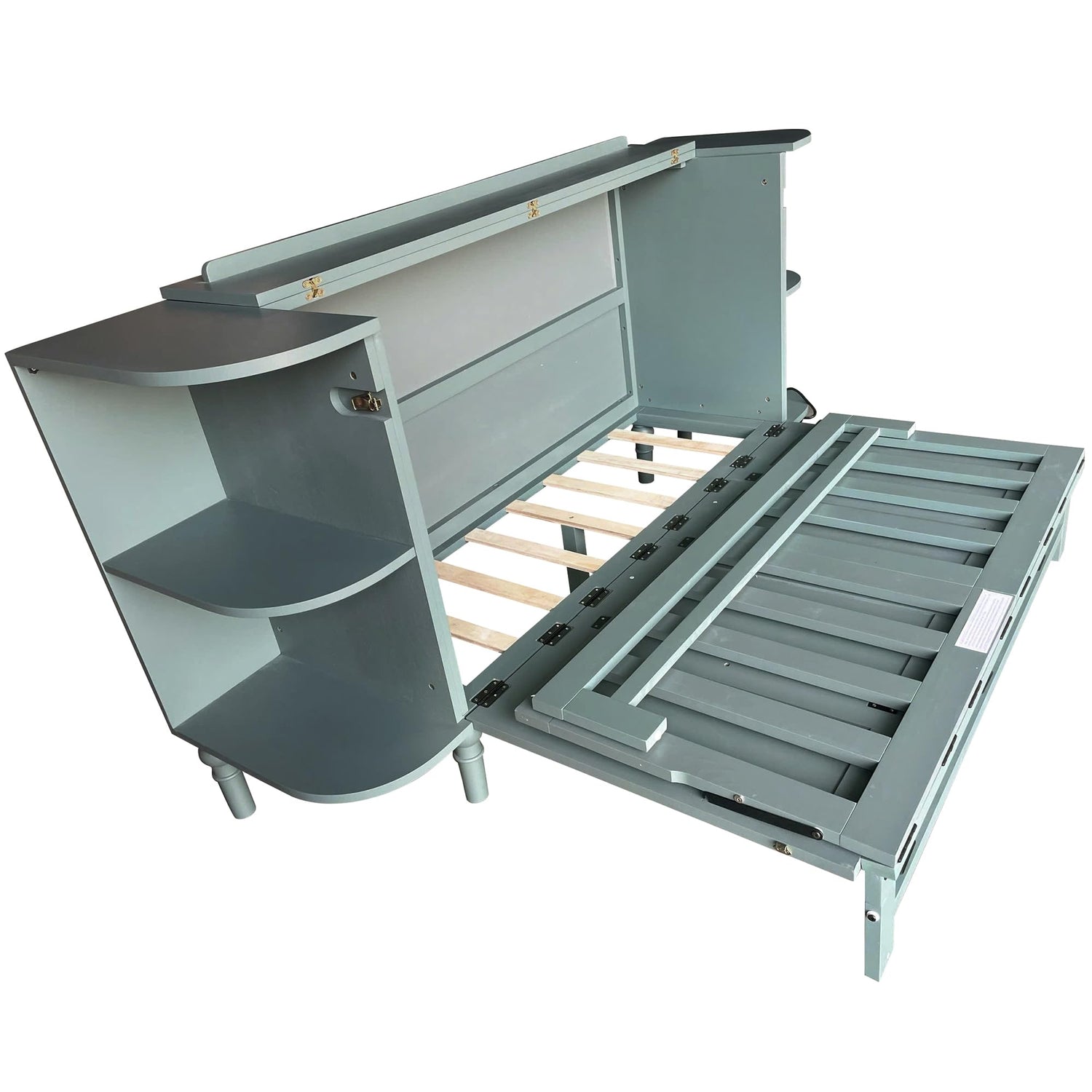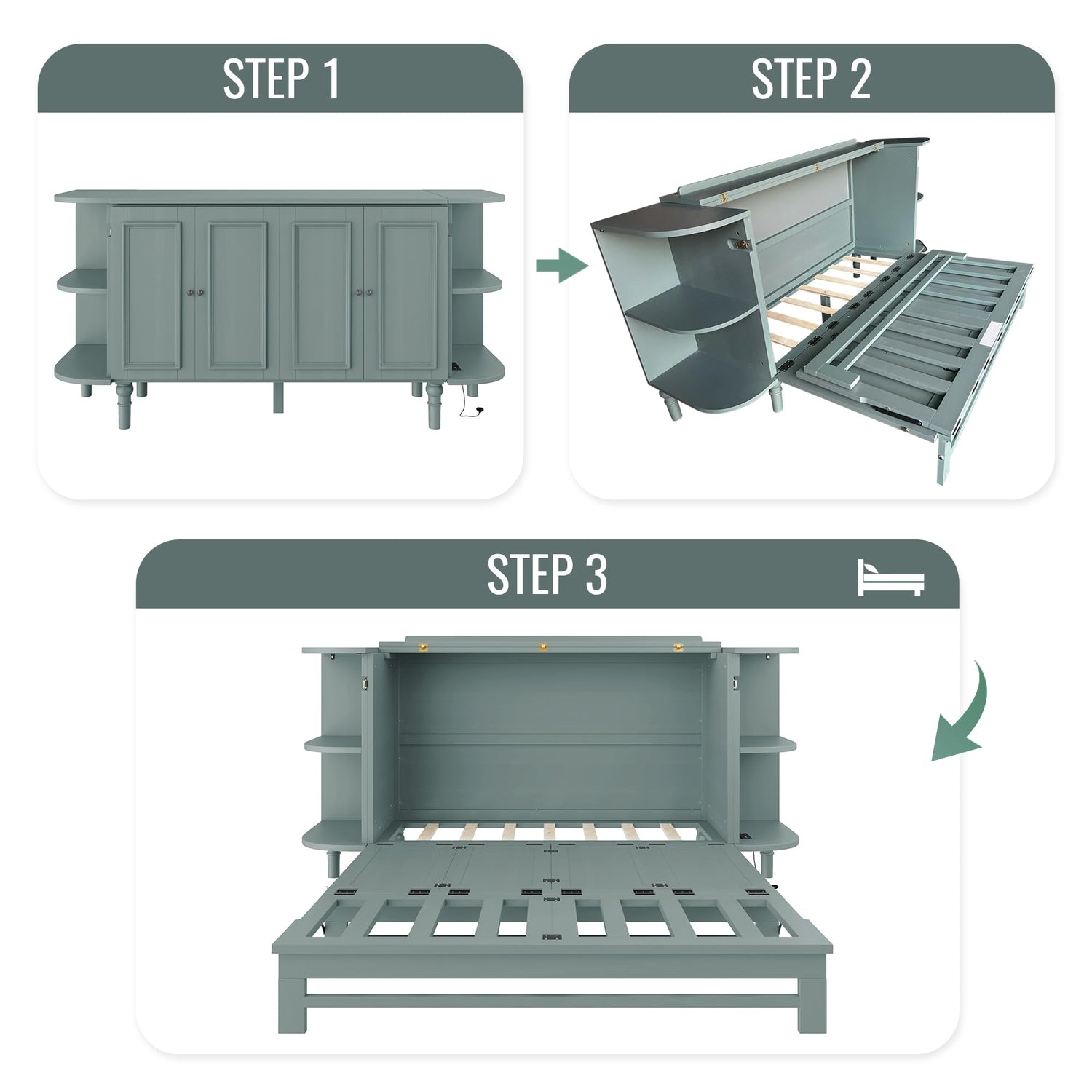 VilroCaz Farmhouse Queen Size Murphy Bed Chest Cube Cabinet Bed with Charging Station and 2 Open Shelves, Solid Wood Folding Platform Bed for Home Office Guest Room Small Room (Venus Teal, Queen)