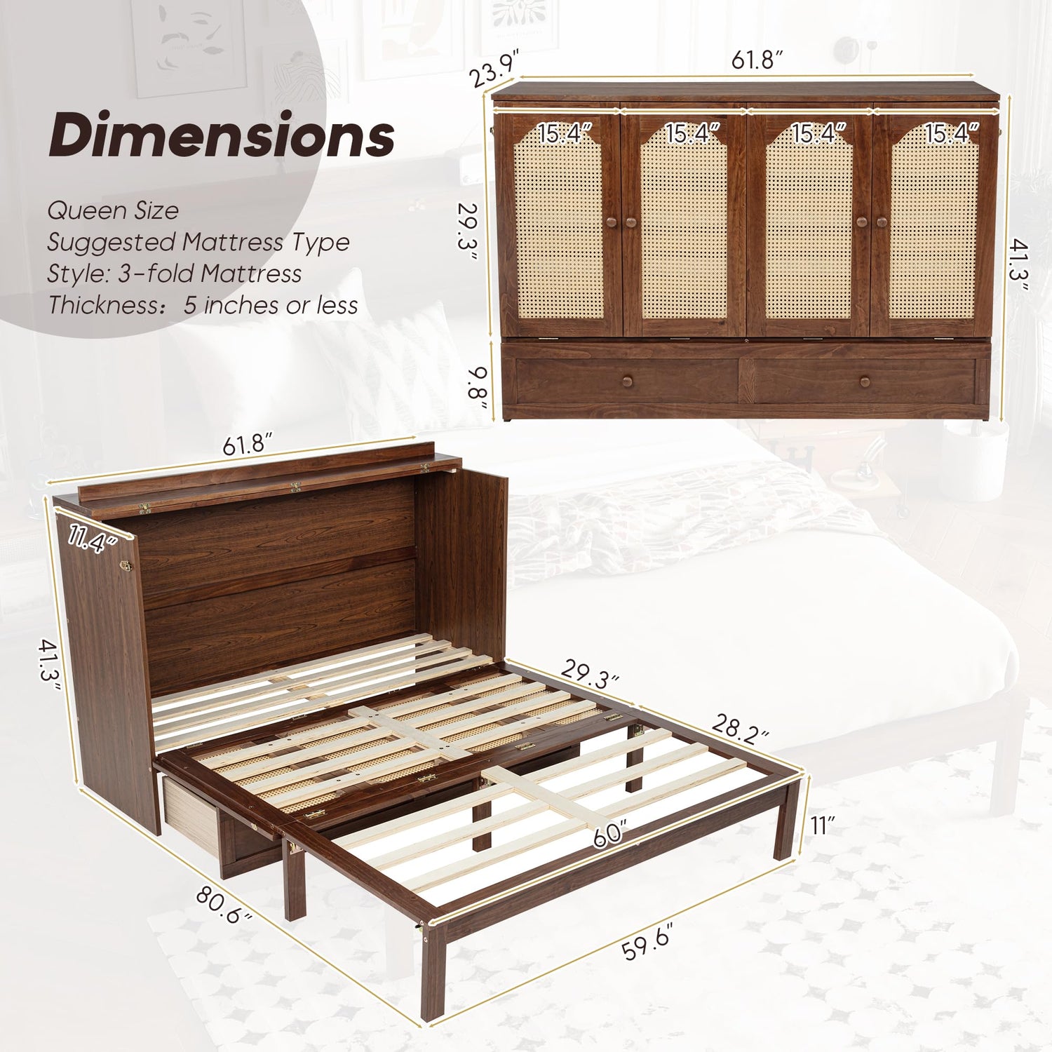 ZEIINPA Queen Murphy Bed Chest with Charging Station & Large Drawers, Wooden Cube Cabinet Bed with Foldable Bedframe for Apartment Living Room Bedroom(Mattress not Included) Walnut