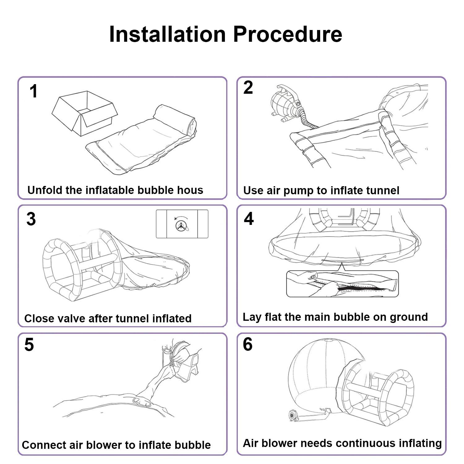 - [Enough Space] The length of AEOR inflatable dome bubble house is 10ft, the height is 7.5ft, providing enough room for kids to play with their friends, enjoy the pure fun.Come with everything you need,including air blower, air pump, repair materials and stakes.It only takes a few minutes to inflate our bubble house with air pump and air blower
