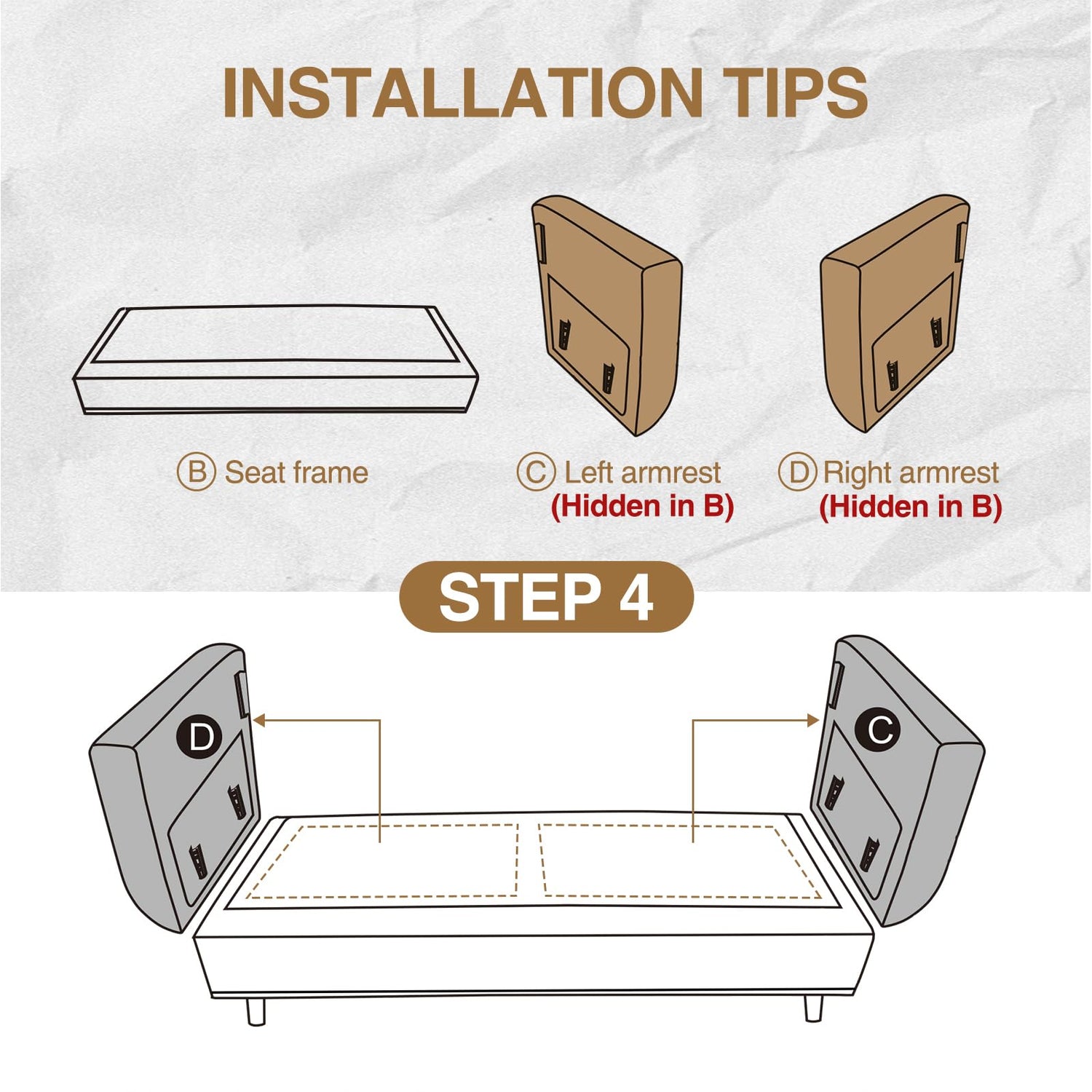 - Assembly Tips: Our cozy soft loveseats is shipped in a box with detailed installation instructions. NOTE: the two armrests ( C&D ) are inside the sofa seat frame (B) and you can check out the assembly video for quick installation