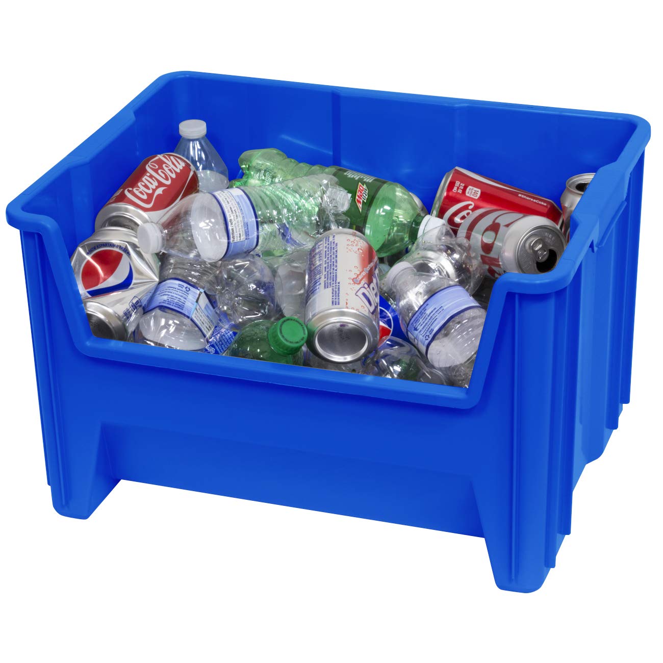 Details: These handy stacking open front storage containers are large and roomy and strong enough to hold almost anything. Same size Stak-N-Store bins will stack to form tall, stable storage arrangements on floors or standard shelving units. Perfect for closets, sheds, pantry organizing, cat food cans, kid’s playrooms, laundry rooms, garages, classrooms, barn storage, and more. Great recycling bins. Large comfort grip handles make them easy to move even when full. Quality construction. Made in the USA.