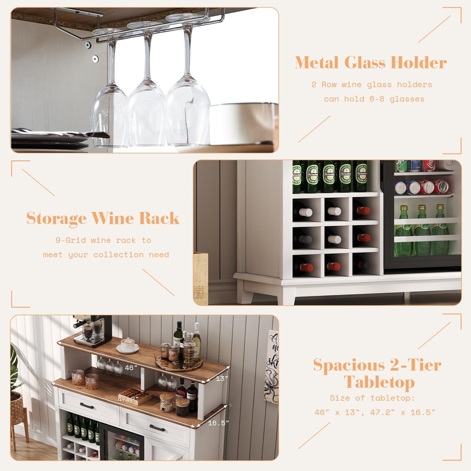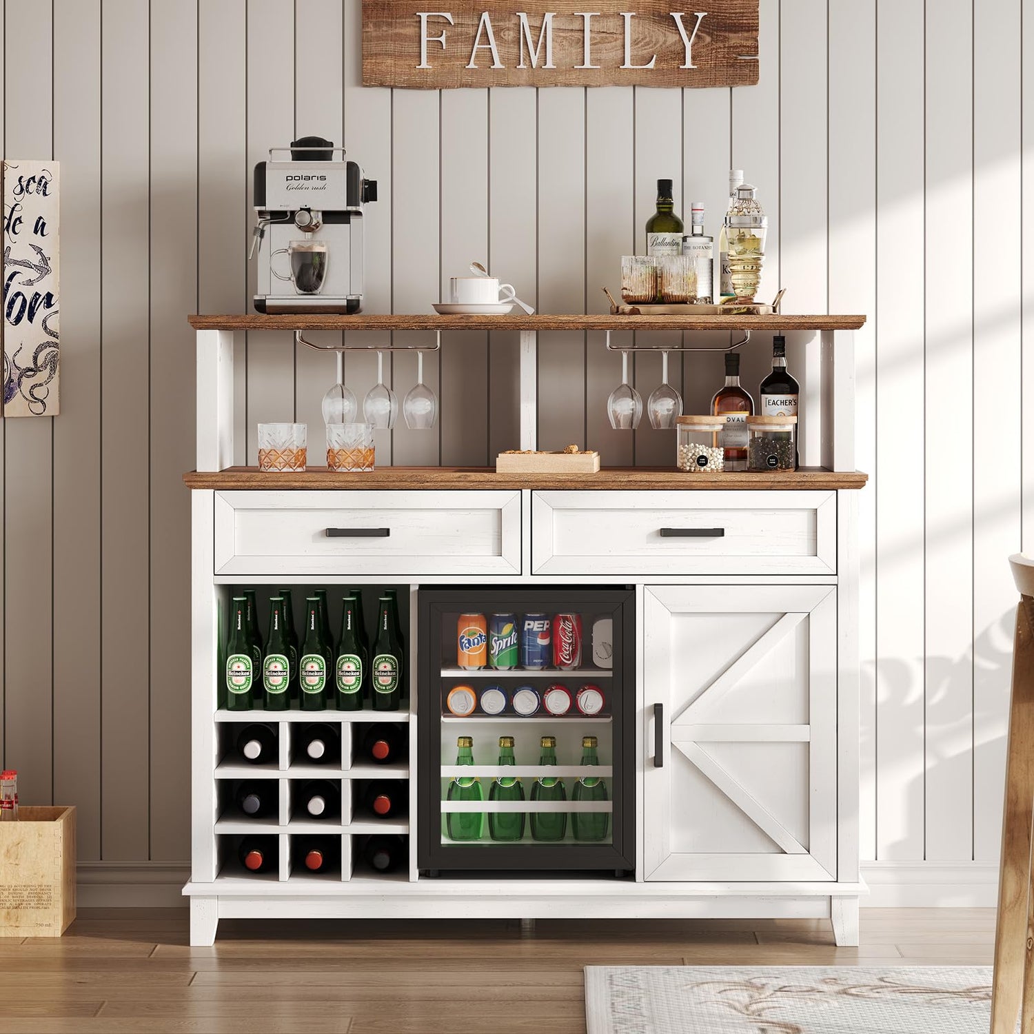 AMERLIFE 47" Farmhouse Coffee Bar Cabinet with 15" Refrigerator & Wine Rack & Glass Holder, Wine Cabinet with Storage Drawers & Open Shelves, Sideboard Buffet Cabinet for Dinging Room, Living Room
