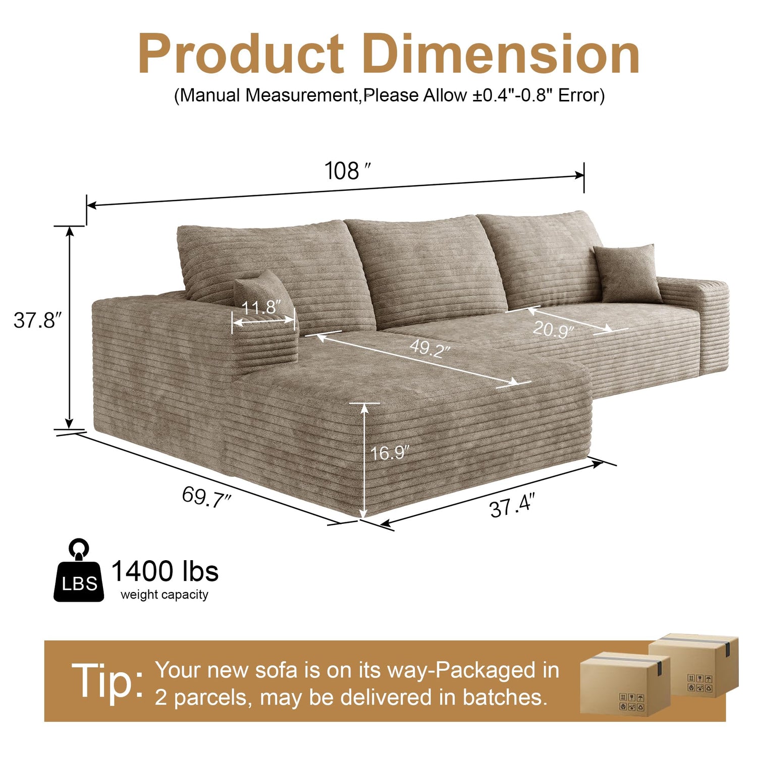 - Modular Sectional Sofa: Experience the ultimate in relaxation with this cloud couch–inspired L-shaped couch, designed for both comfort and style. Featuring clean lines, a sleek modular structure, and ultra-soft corduroy fabric, this sofa maximizes space while creating a cozy, inviting atmosphere. Perfect for living rooms, apartments, or bedrooms, this corner sofa adds a timeless, sophisticated touch — making your space feel warm, inviting, and truly your own. Bring home comfort and style that you’ll be happy with every day.