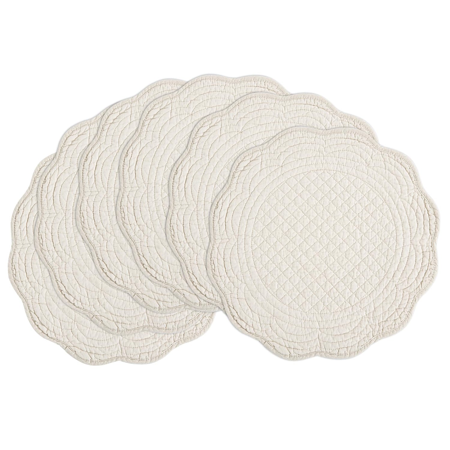 BALAPET Quilted Placemats Set of 6, 100% Cotton 14" Table Mats Farmhouse Style, Reversible Round Tabletop with Scalloped Edges for Kitchen Dinner Party Holidays, Natural, Machine Washable