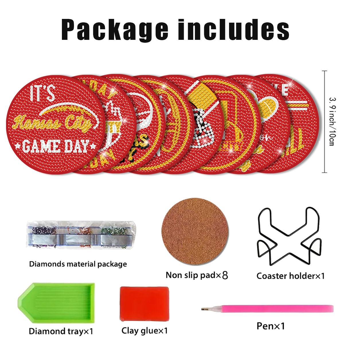 This DIY Diamond Art Painting Coaster kit includes 8 Diamond Art Painting Coasters, 8 Stickable Cork Bases, 1 Set of Colored Diamonds, 1 Coaster Holder, 1 Pen, 1 Clay Glue, 1 Diamond Painting Tray, and an Extra Gift of 10-30% extra Diamonds.