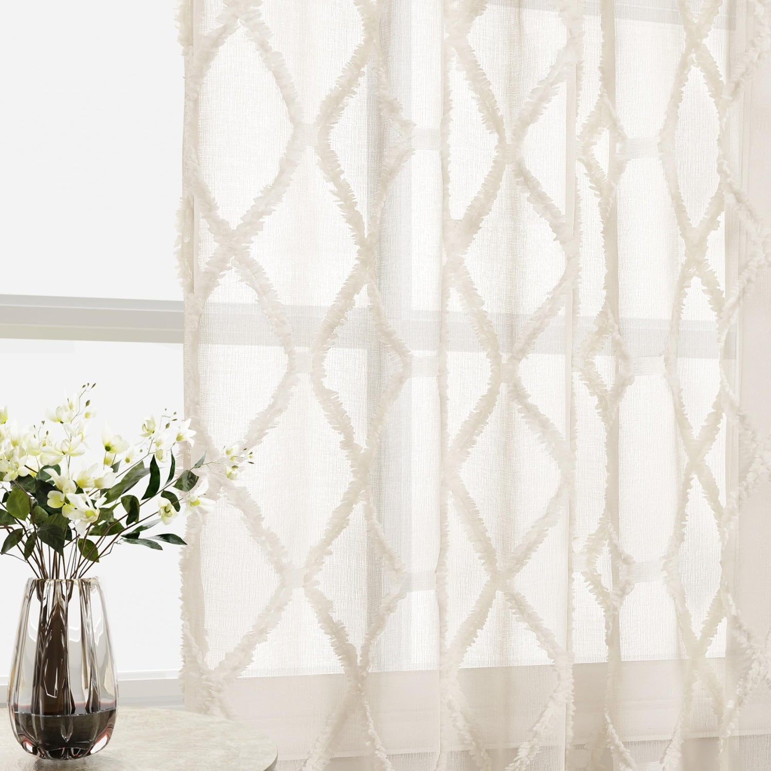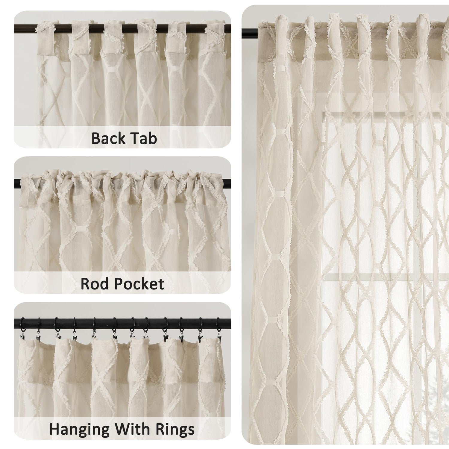 Beige Sheer Curtains 84 Inches Long for Living Room Rod Pocket Back Tab Sand Taupe Tan Semi Sheer Curtain Geometric Embroidered Tuft Pom Textured Drapes Earth Tone Farmhouse Rustic Bedroom Nursery