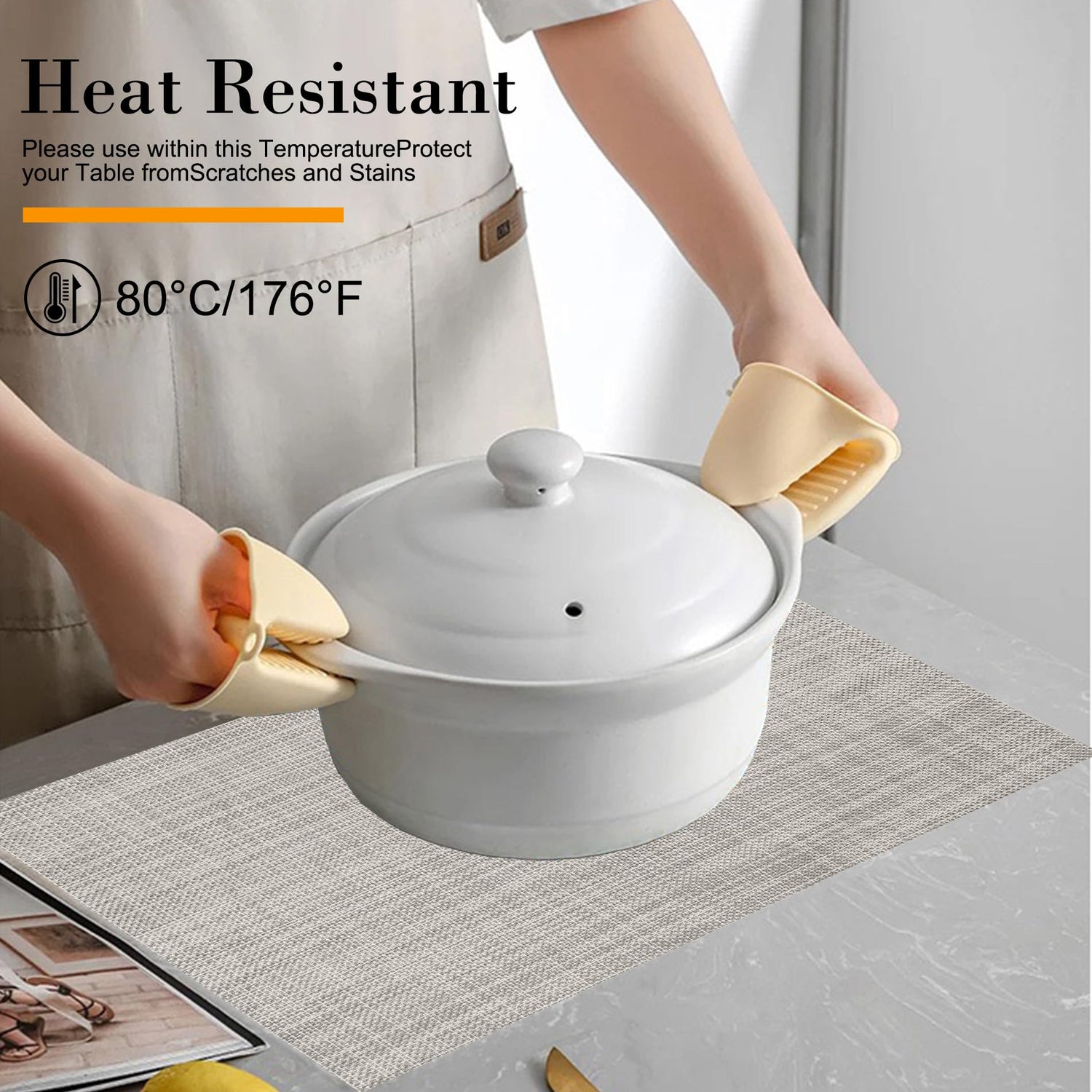 - Protect Your Table:Our placemats protect your table from scratches and spills while adding style. Heat-resistant up to 176°F (80°C), they also keep your food warm. With high-quality woven vinyl construction, they resist stains and water for daily use. Elevate your dining experience with these elegant and durable mats.