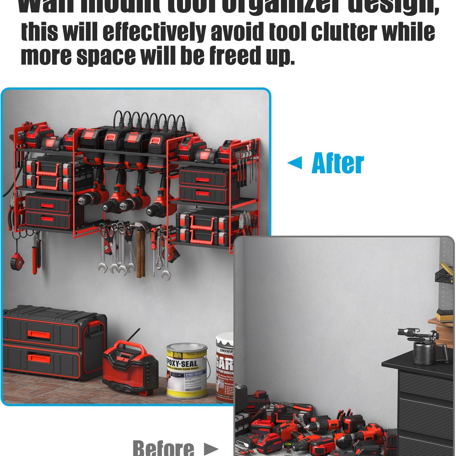 - About large size 39 inch long garage organizer with charging station, provides large enough storage space for 8 drills and 7 shelves. Open slot for up to 8 cordless drills, can also hang tools with holes if you don't have that many drills. The tools in the picture are for demonstration purposes only and are not included.