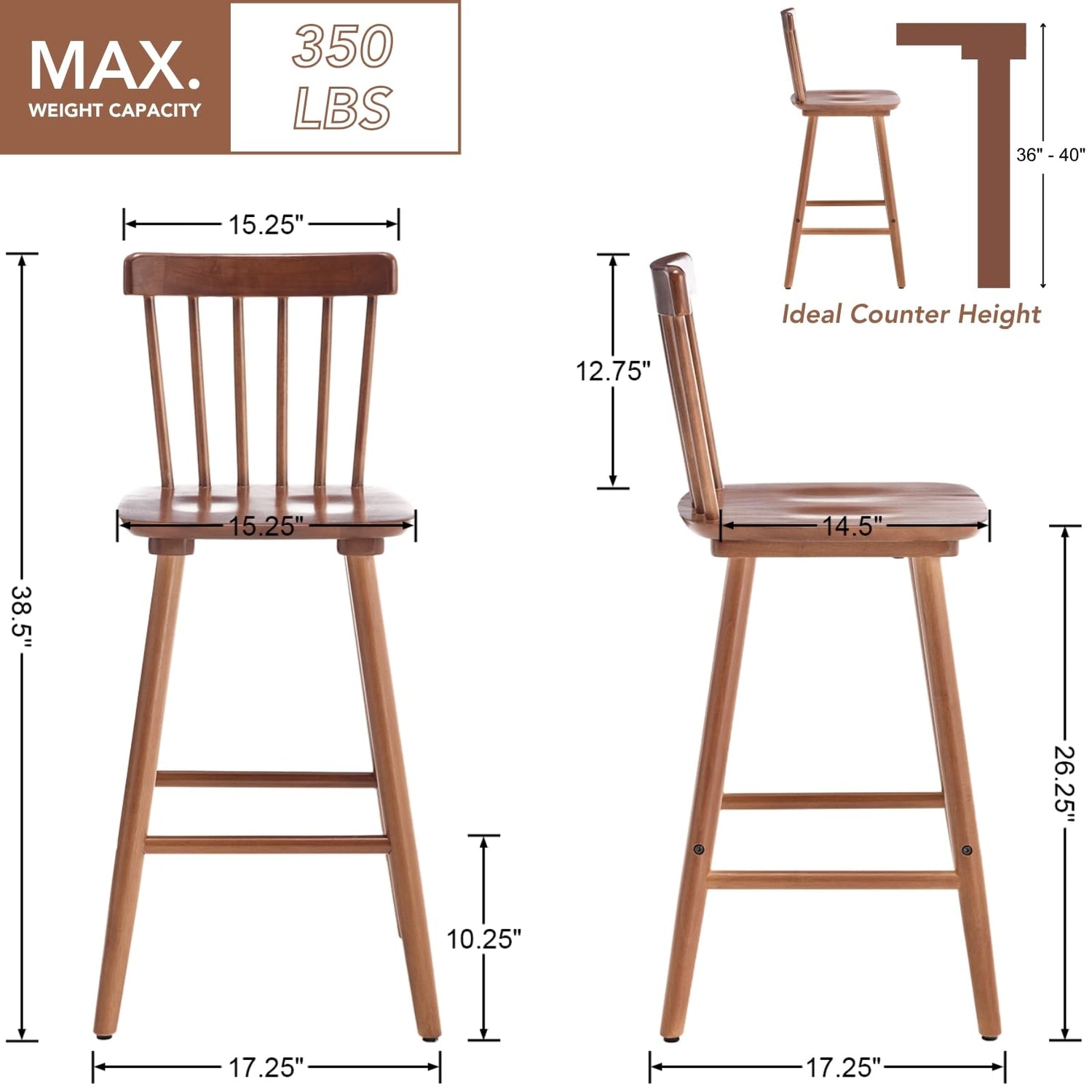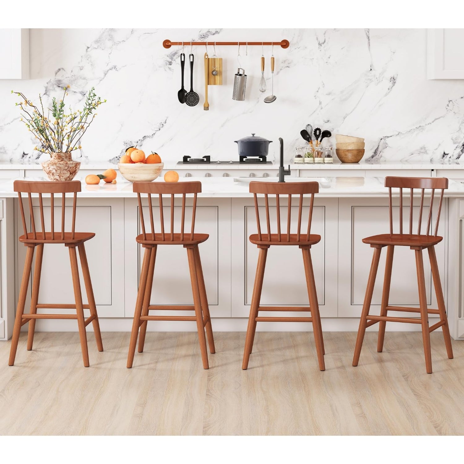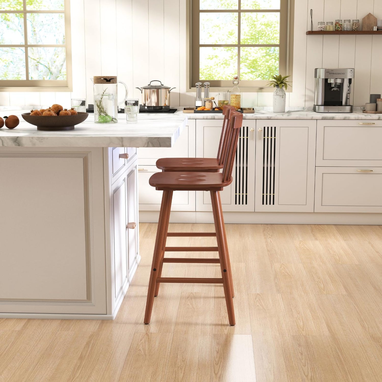 - Classic Farmhouse Charm: These Windsor-style counter-height bar stools feature a spindle backrest and a smooth, contoured seat that evoke timeless farmhouse appeal. Their graceful lines and understated design bring a warm, welcoming vibe to any interior