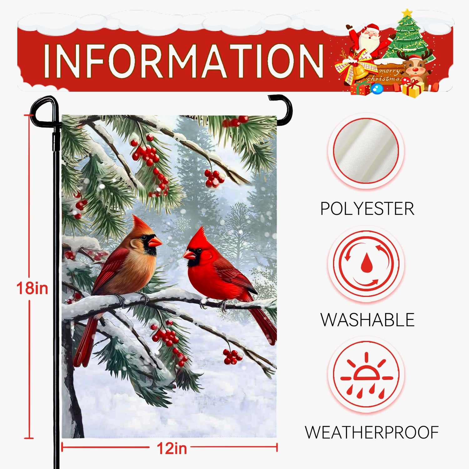 - Flag Size: This Winter Cardinals garden flag is the small, mini garden size measures 12X18 Inch (30x45cm), FLAG STAND/POLE NOT INCLUDED.