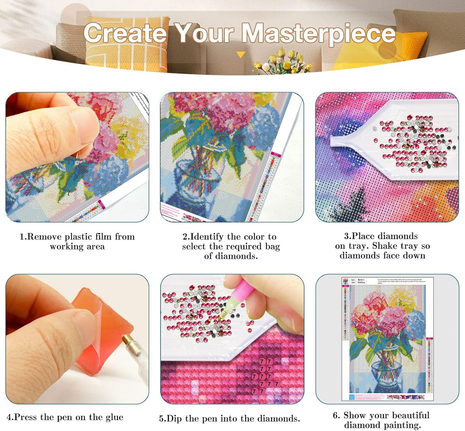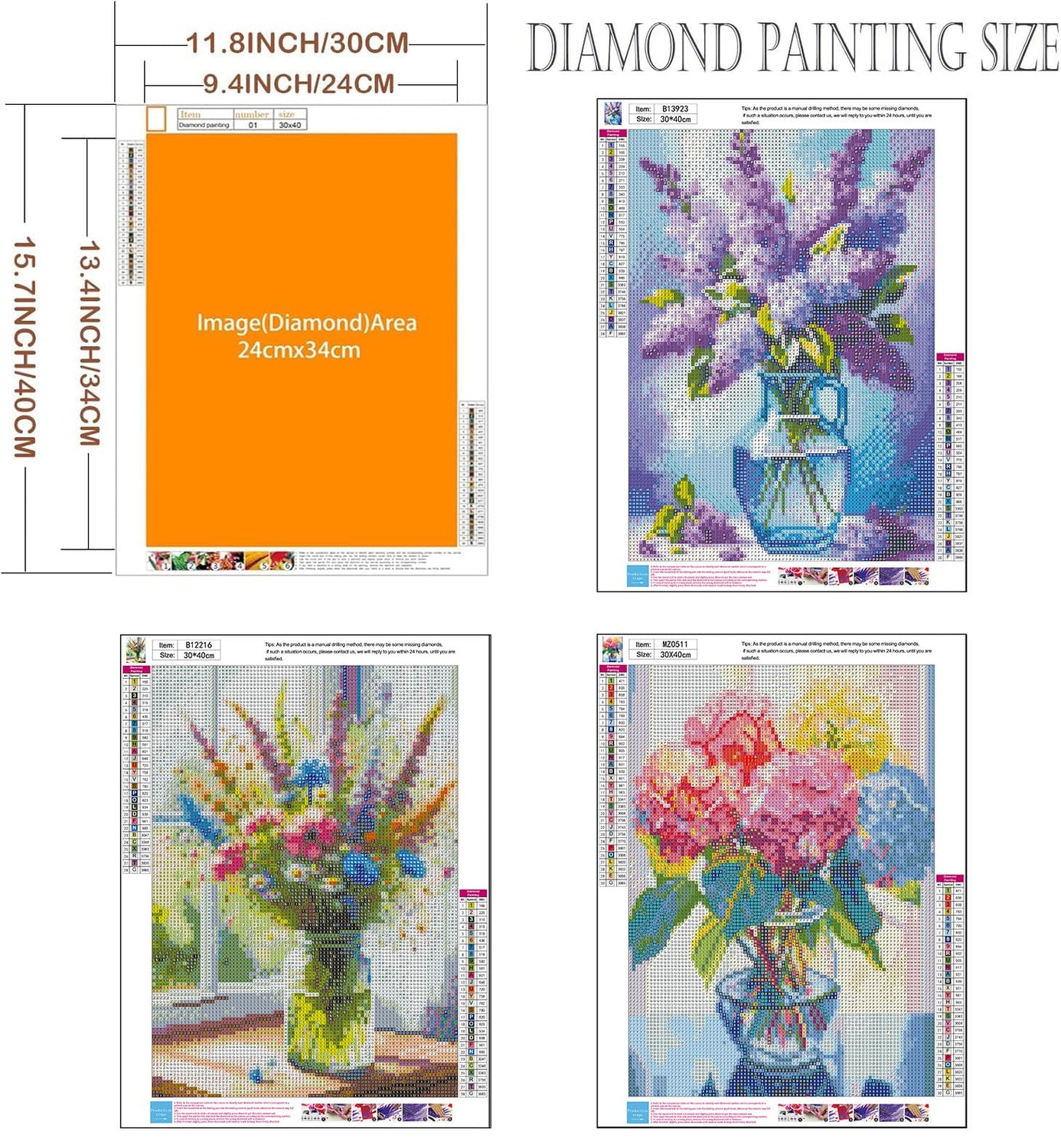 • Diamond painting size and package: Including 3×high definition 12x16in vase painting canvas, 3×point diamond pen, 3×craft tray, 3×clay, 30×self-sealing bags. Don’t worry about the lack of diamonds. We will add 30 percent to each color of diamond. Note: The frame is not included.
