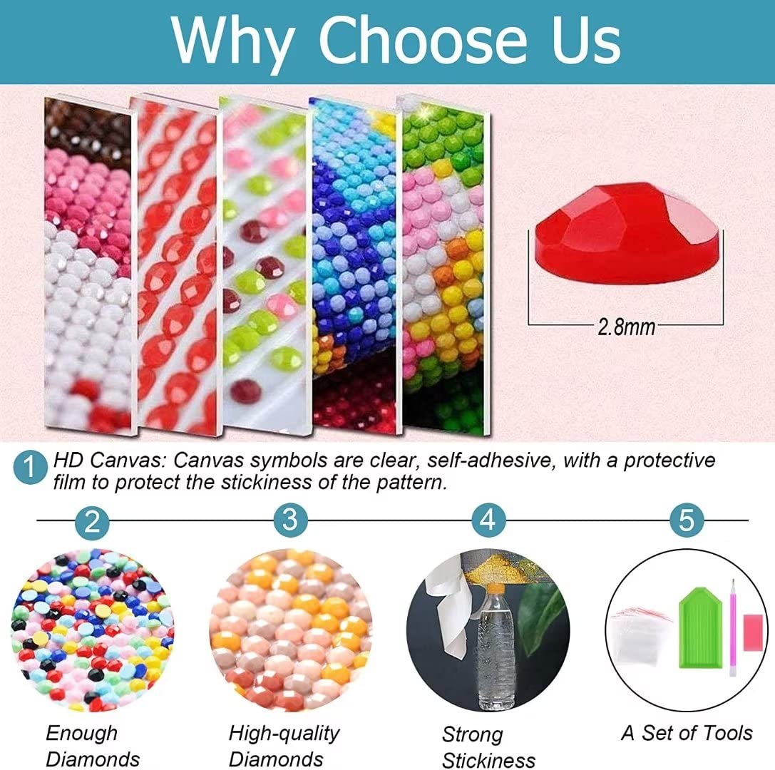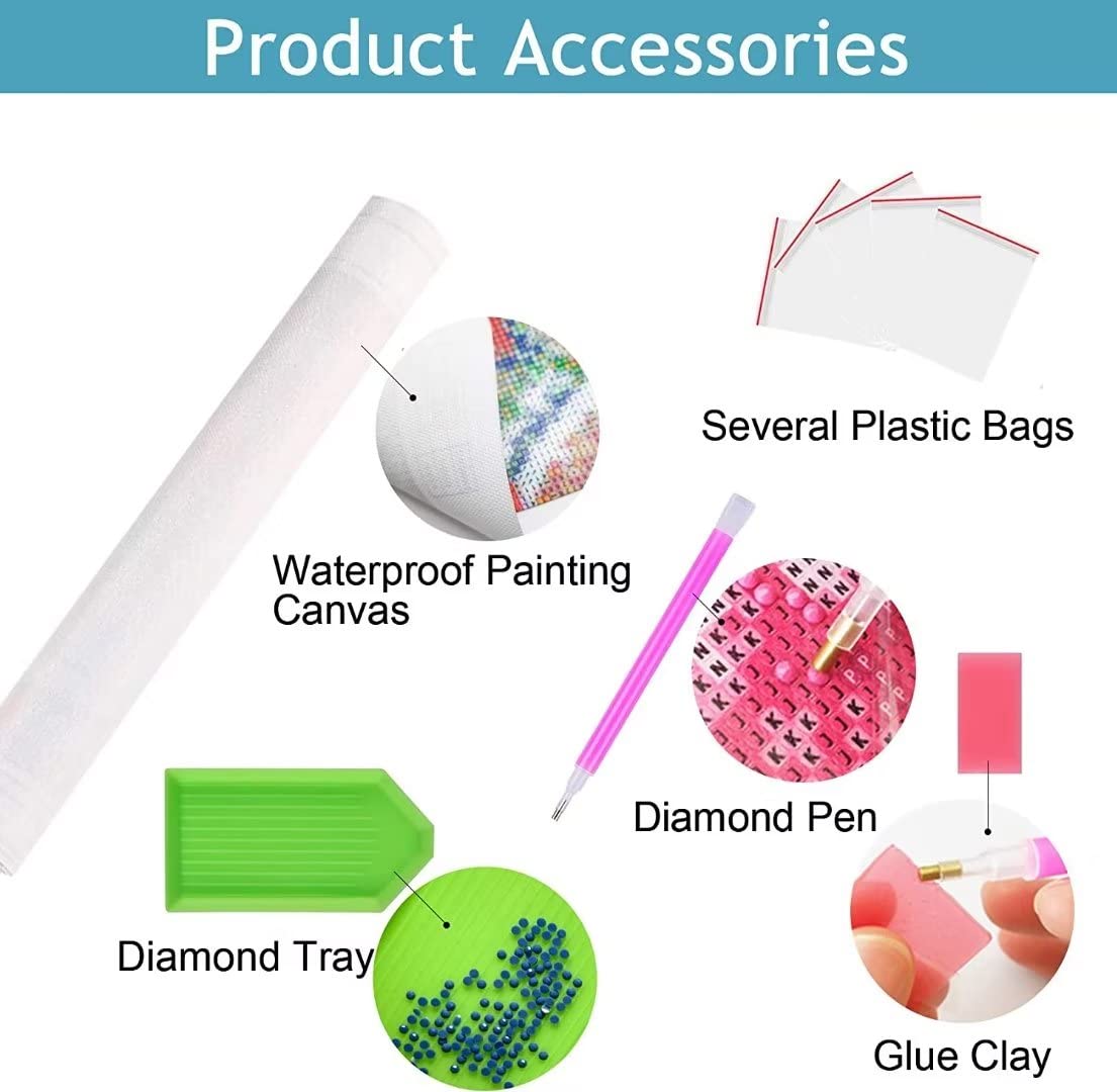 • 2.Accessories & Extra Gems Included for Art Diamond Painting - Our paint with diamonds kit comes complete with 1 artworks, 1 diamond art pens, 1 interchangeable tips, 2 diamond art wax and 1 diamond painting trays and 30% extra diamond gems in handy reseleable bags.