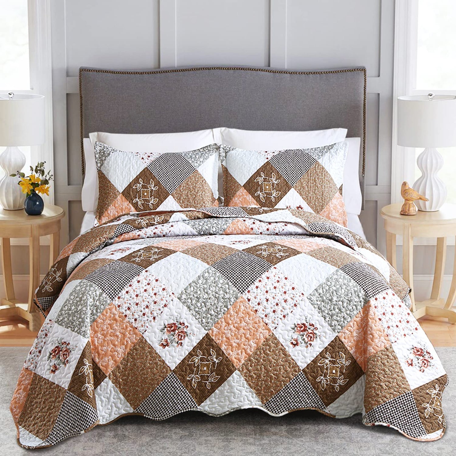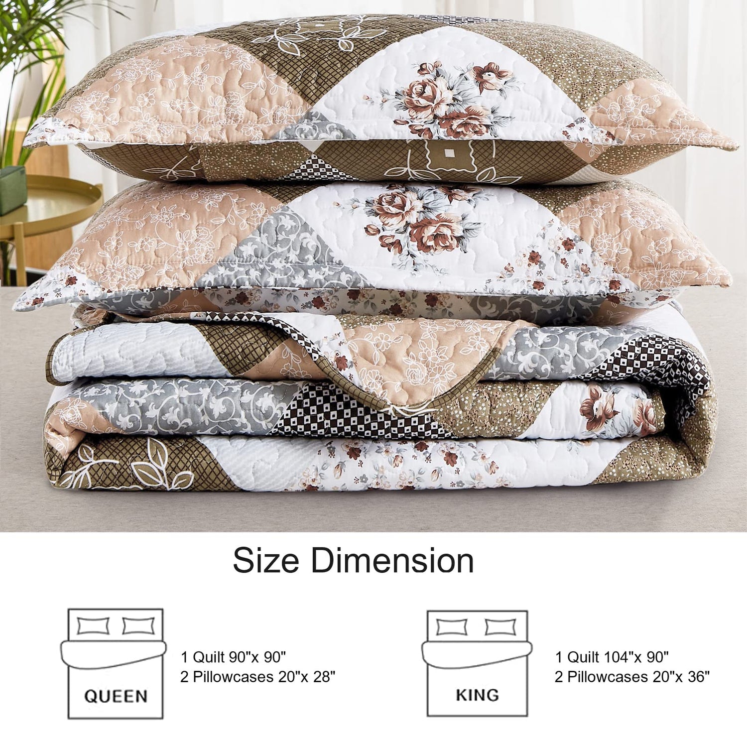 Dinjoy Floral Plaid Patchwork Quilt Set California King Size, Reversible Brown Bedding Set Soft Microfiber Lightweight Bedspread Coverlet 3 Piece Fall Autumn Use(106x96 inches, Cal King)
