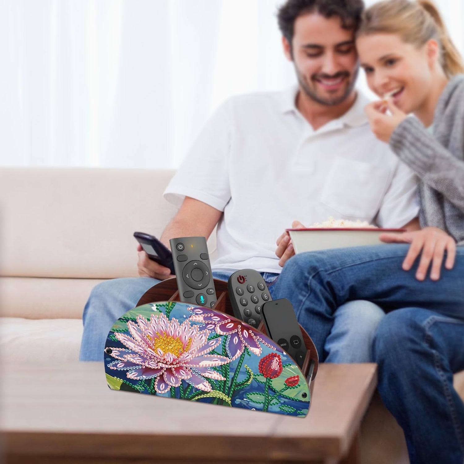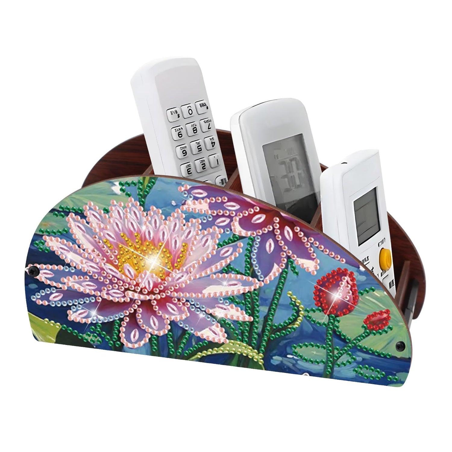 DIY Diamond Painting Remote Control Holder – Blooming Pink Lotus Design with Blue Water Background, Diamond Art Decorative Organizer Box for TV/AC Remotes, Makeup Brushes, Desk Supplies