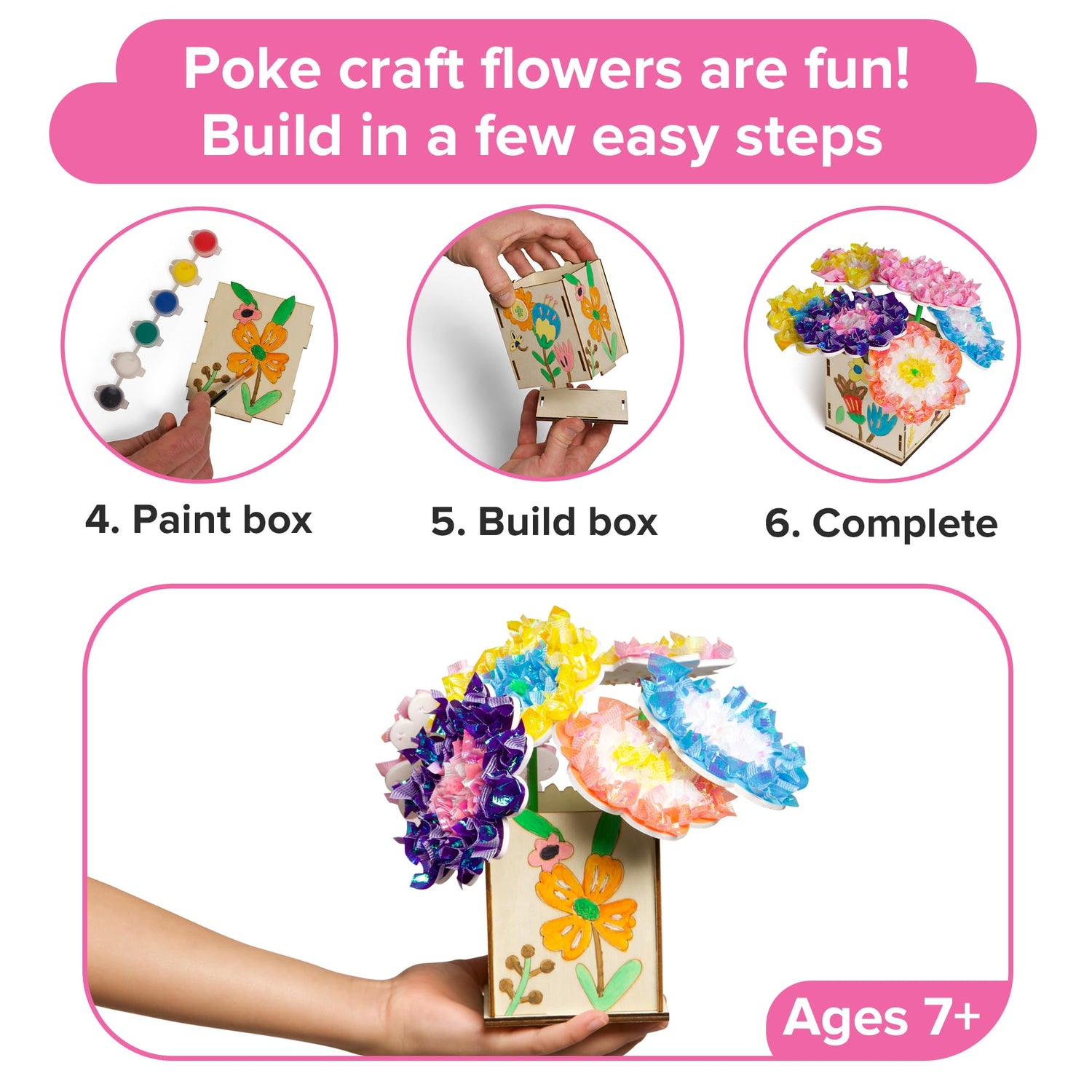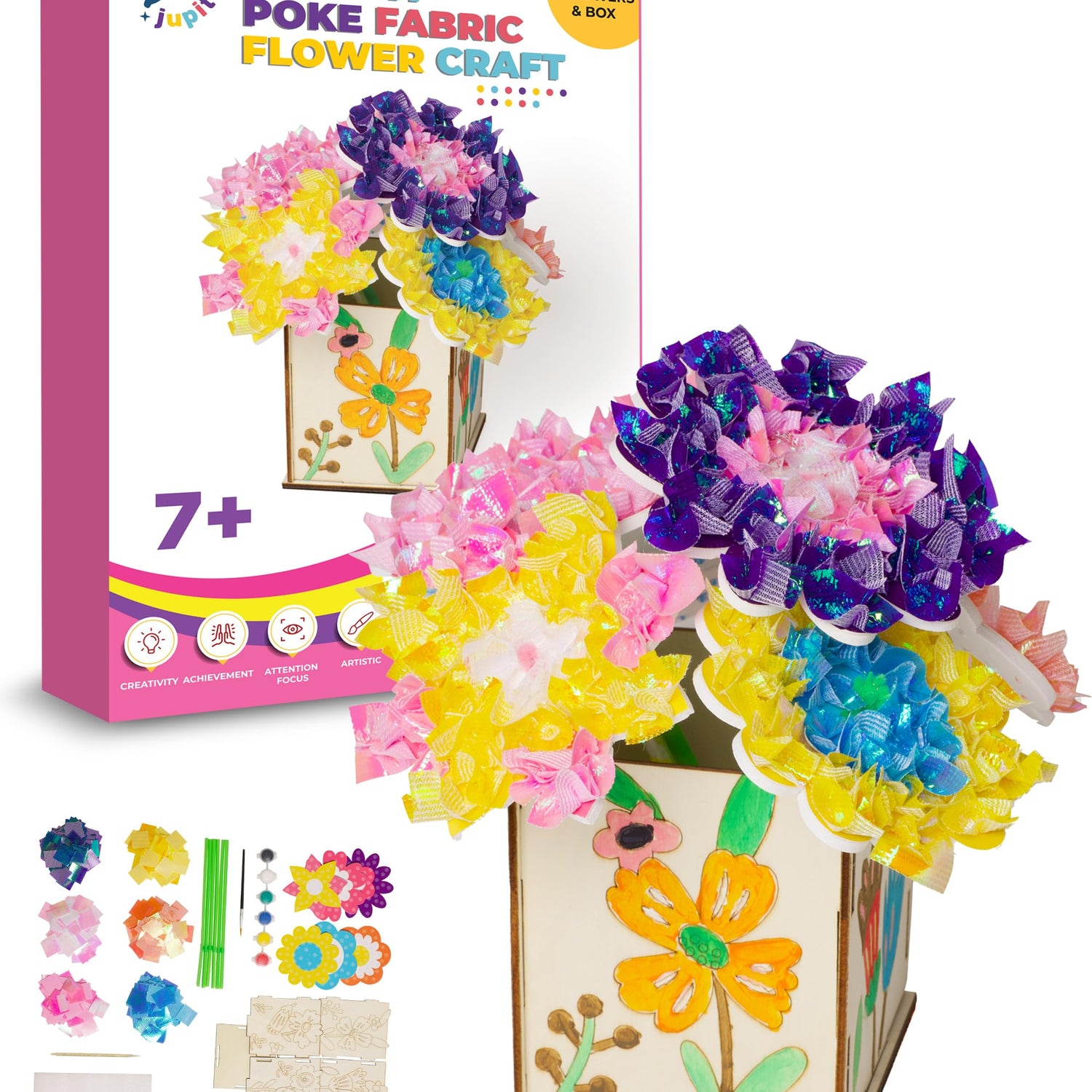 - Complete Poke In Art Flower Bouquet: A unique two part arts & craft kit that allows children to use pre cut fabric squares & EVA foam flowers to customize an flower bouquet & box. Includes customizable wood flower box, paint, and brush.