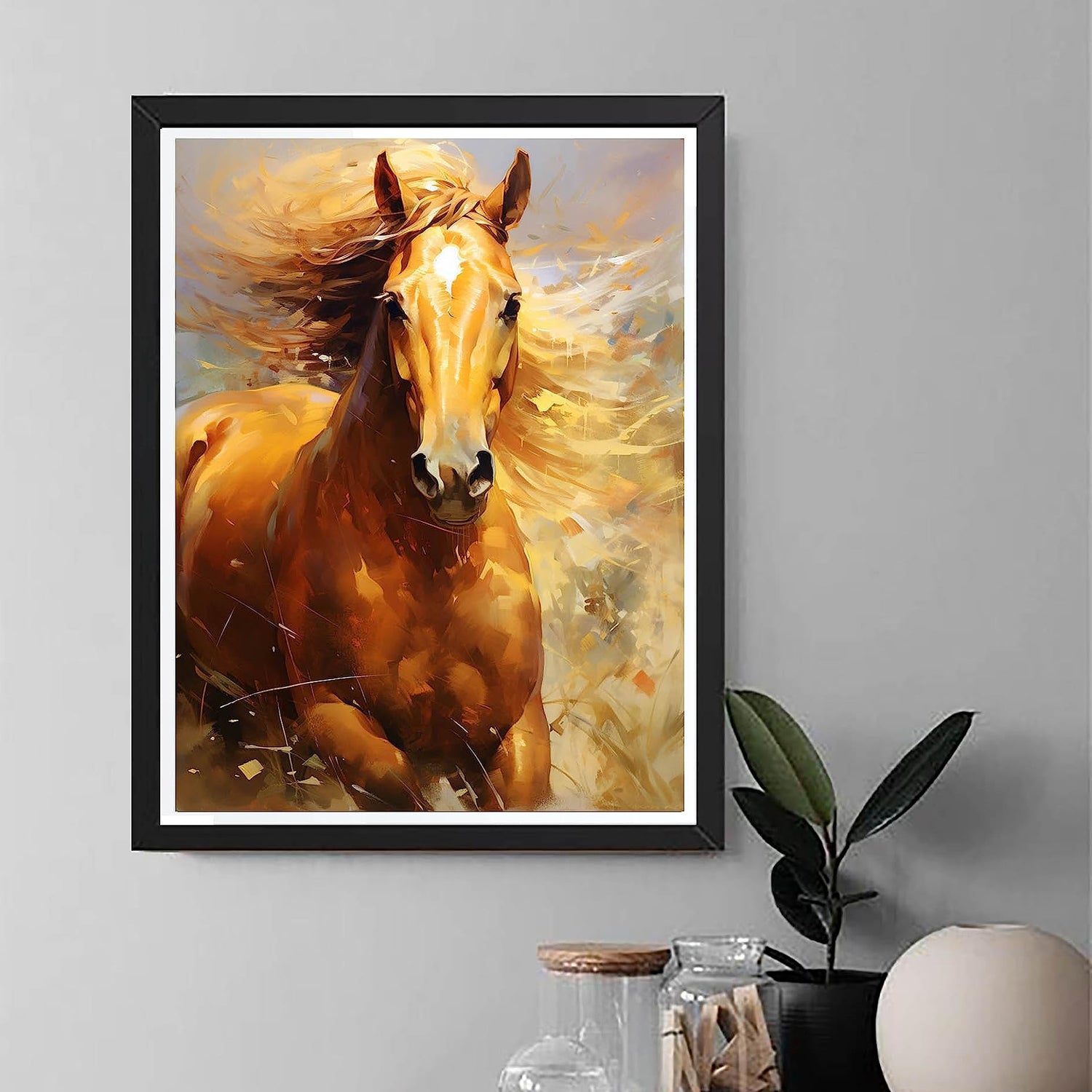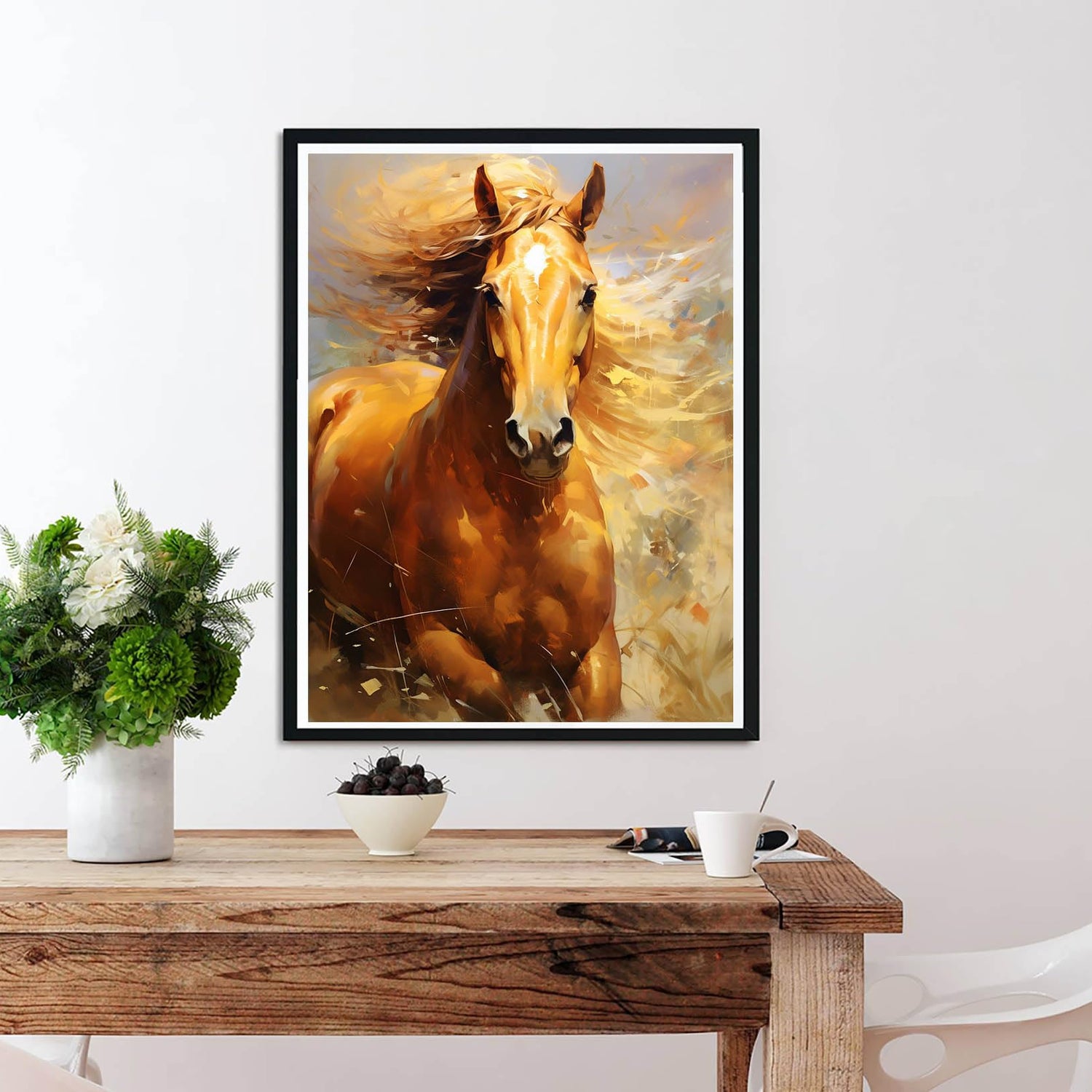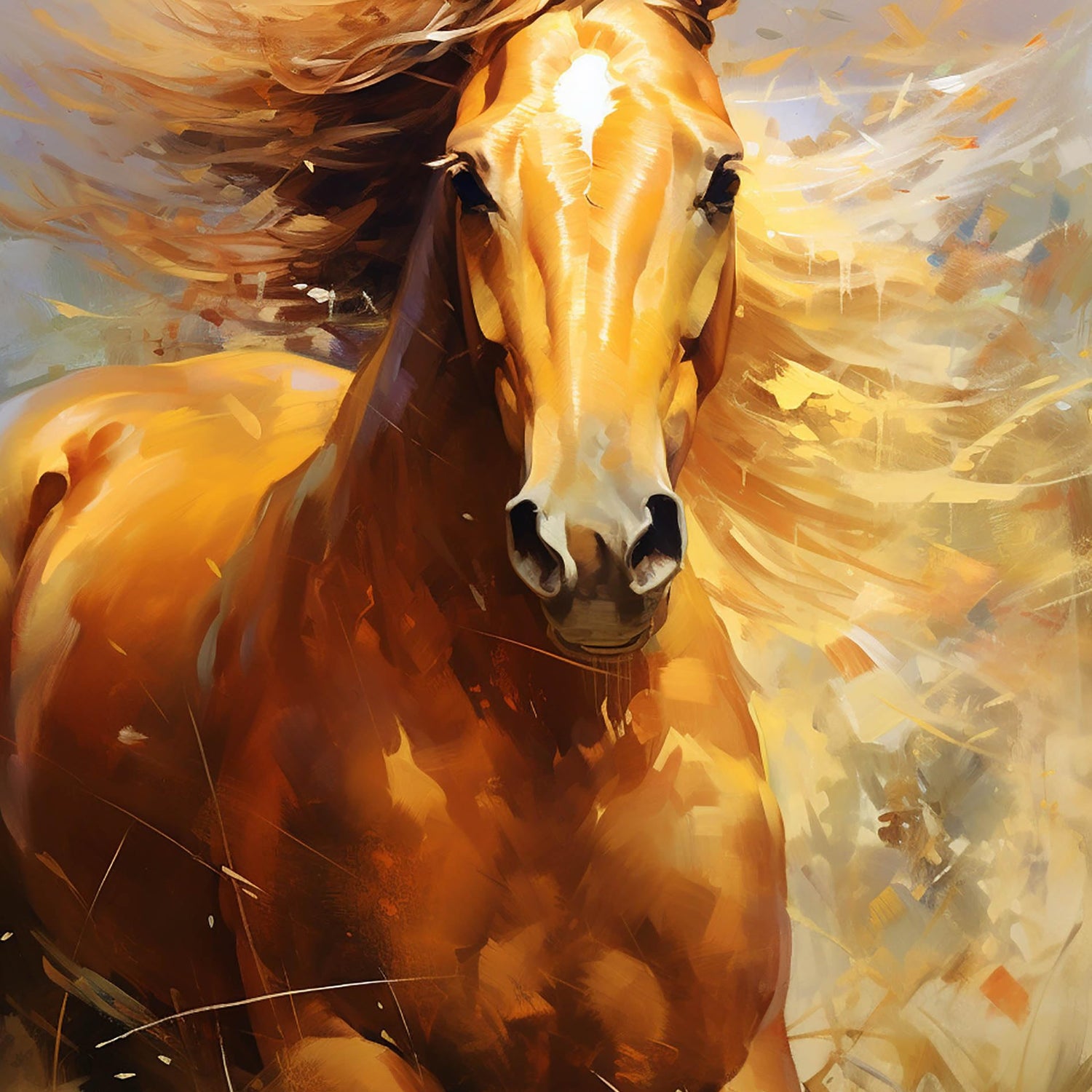 - A majestic horse stands with its mane flowing in the wind, symbolizing freedom and strength. The golden hues and dynamic brushstrokes capture the essence of a powerful spirit, embodying resilience and grace. This image invites one to embrace the wild and fearless spirit within.