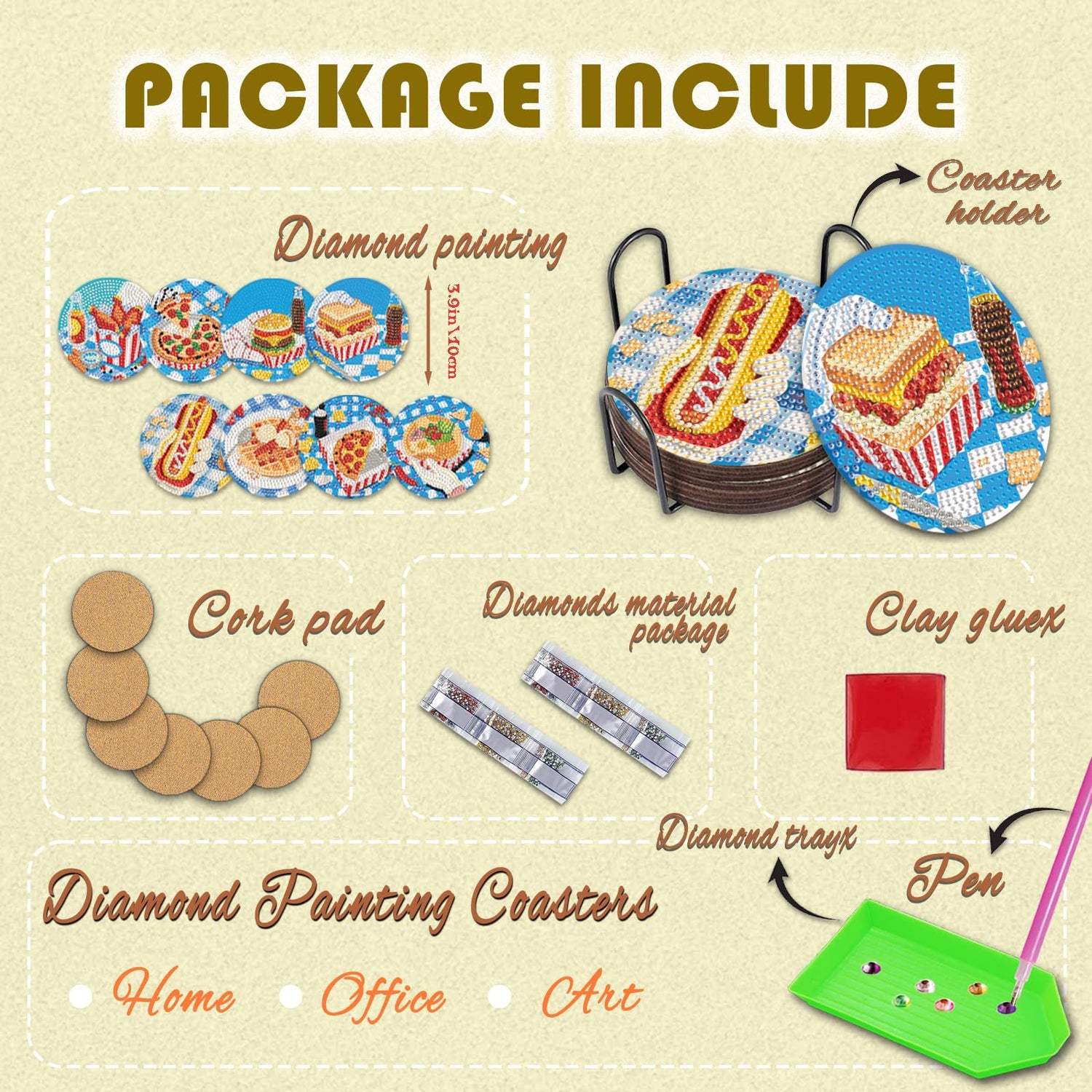 - This DIY kit Includes :8 Diamond Art Painting Coasters, 8 Adhesive Non-Slip Cork Bases, 1 Set Of Colored Diamonds, 1 Coaster Holder, 1 Diamond Pen, 1 Wax Clay, 1 Diamond Painting Tray