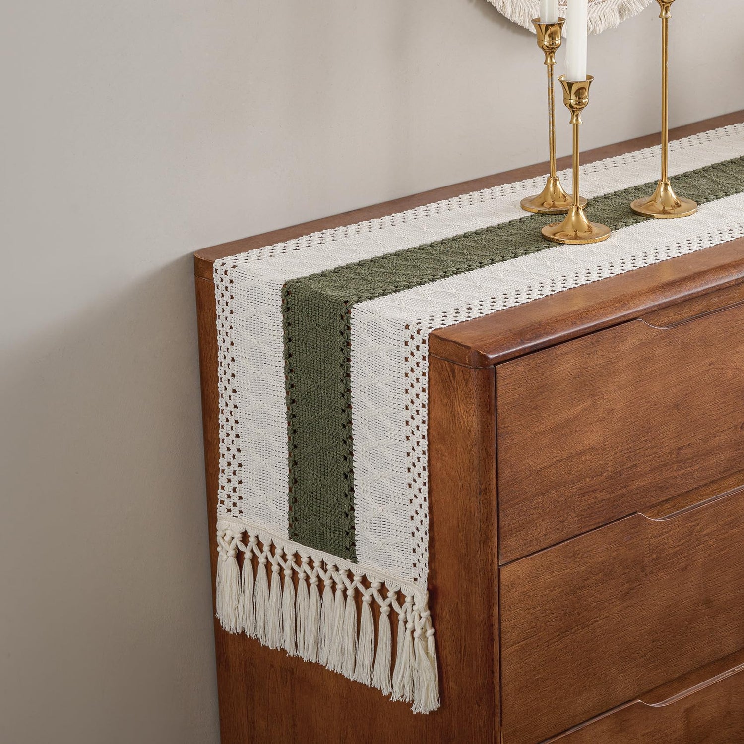 duduta Sage Green Macrame Table Runner 72 inch Long, Rustic Farmhouse Dresser Covers Boho Summer Coffee Table Decor