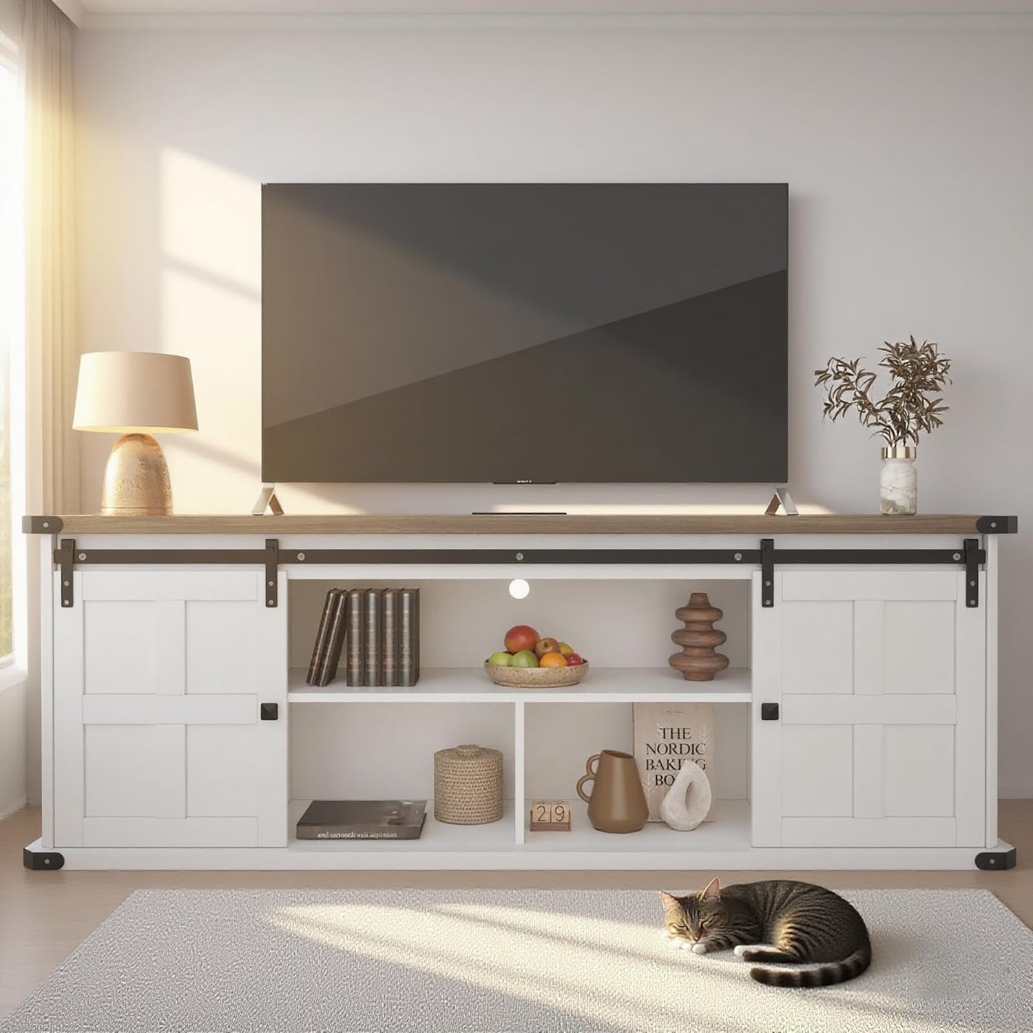 Featuring spacious storage cabinets and a media console design, this TV stand offers ample room to organize your media devices, DVDs, gaming consoles, and other essentials. The sliding barn doors add a unique farmhouse touch while providing easy access to your equipment. Integrated power outlets keep your devices charged and cables neatly managed, reducing clutter and maintaining a clean look.