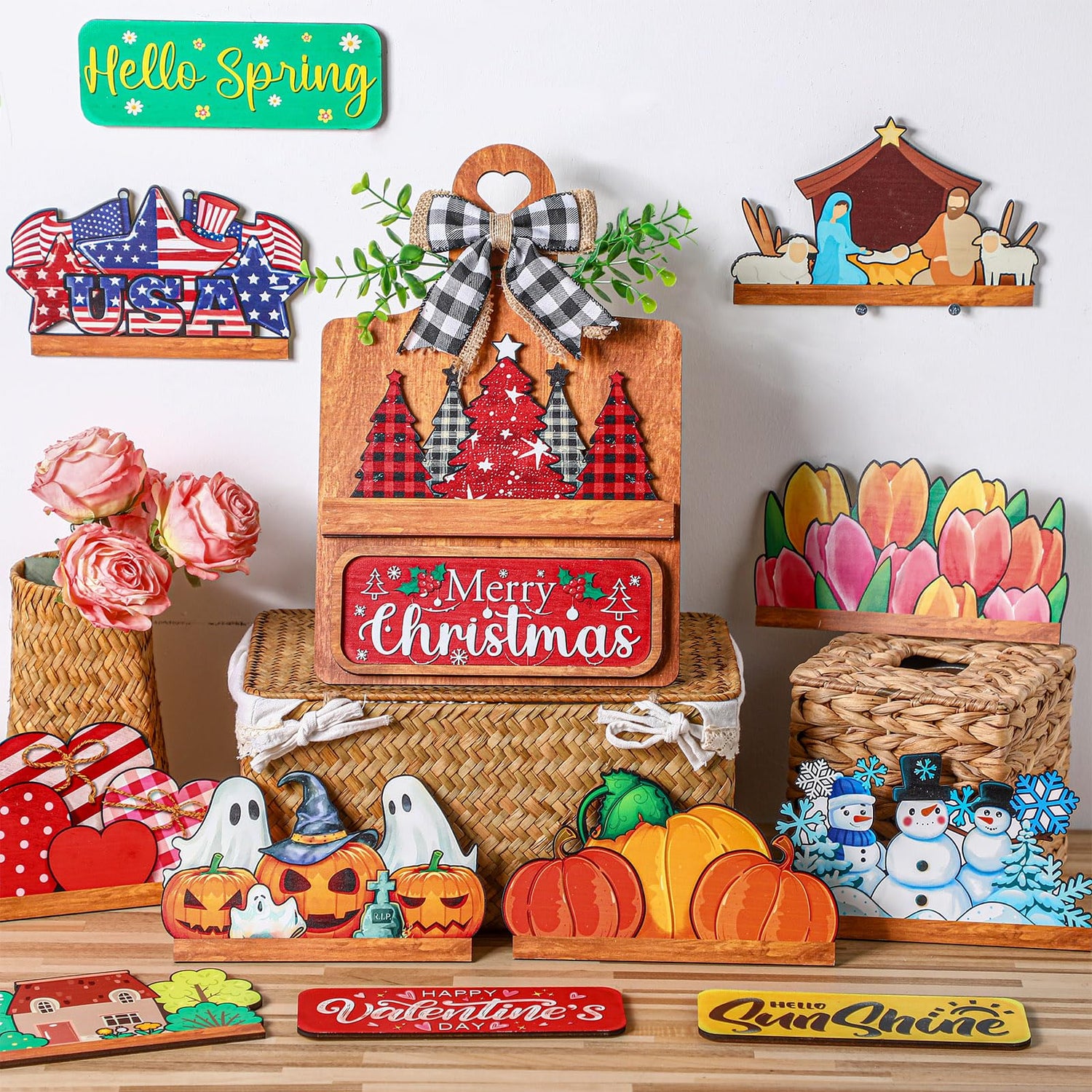 - Easy to Use: first, choose a bow to stick on the top, then put the seasonal wood block into the card slot on the tray, and finally choose the corresponding holiday wood block in the bottom box for magnetic attraction; If you need to change, there is a small hole on the back to easily remove the magnetic wood block; This tray also has a triangular hook on the back, which can be placed on the desktop or hung on the wall