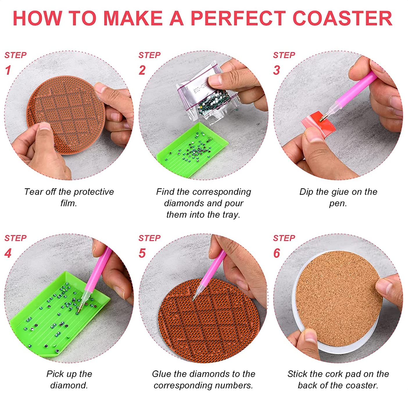 • 【Easy to Use】Our DIY diamond painting kits are equipped with drawing tools that can help you with your making. The making process is as followed. Firstly, tear off the film of the coasters, then pick up the diamonds you need according to the numbers of the coaster. Lastly, stick the diamonds on the coaster.