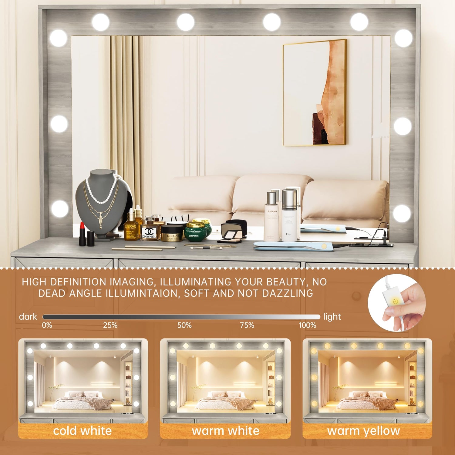 Greenvelly Makeup Vanity with Lights, Grey Farmhouse Vanity Desk with Lighted Mirror, 3 Lighting Modes, Brightness Adjustable, Dressing Table with Drawers, Vanitys Table Set for Women, Girls