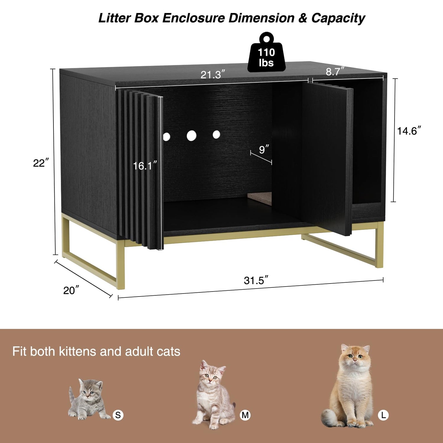 - Stylish and Durable Cat Washroom:The cat washroom storage bench featuring a mix of solid wood-effect finish,gold-finished iron and thick solid fluted panels which are specially crafted with care and precision and creates a contrasting,bold and clean look.The thickened steel tube bottom frame provides strong support for the cat litter cabinet,sturdy and durable.
