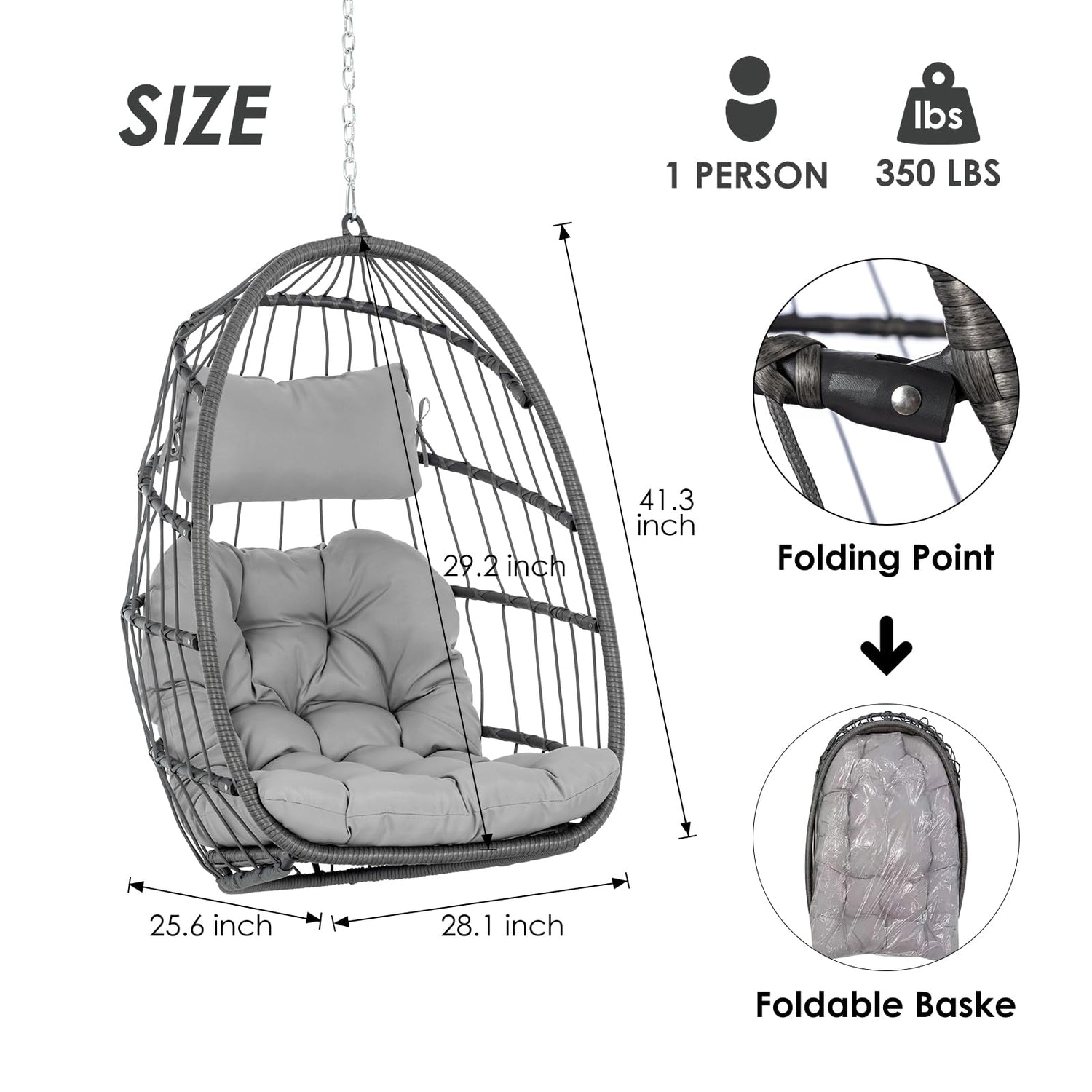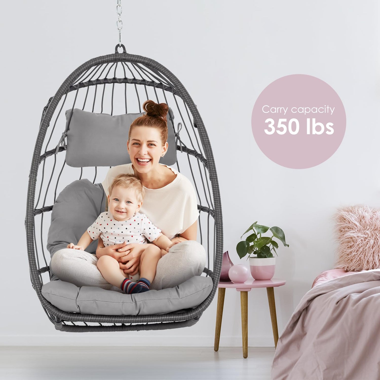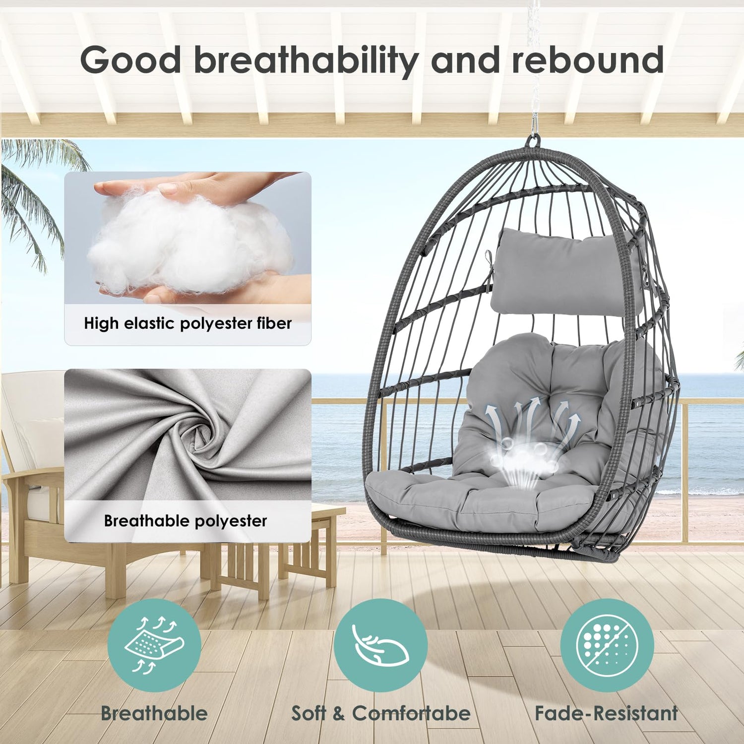 Hanging Egg Chair Without Stand - Foldable Indoor Outdoor Wicker Rattan Swing Egg Chair with Hanging Chain Hammock Chair - UV Resistant Cushions & Aluminum Frame for Bedroom Patio Camping (Grey)